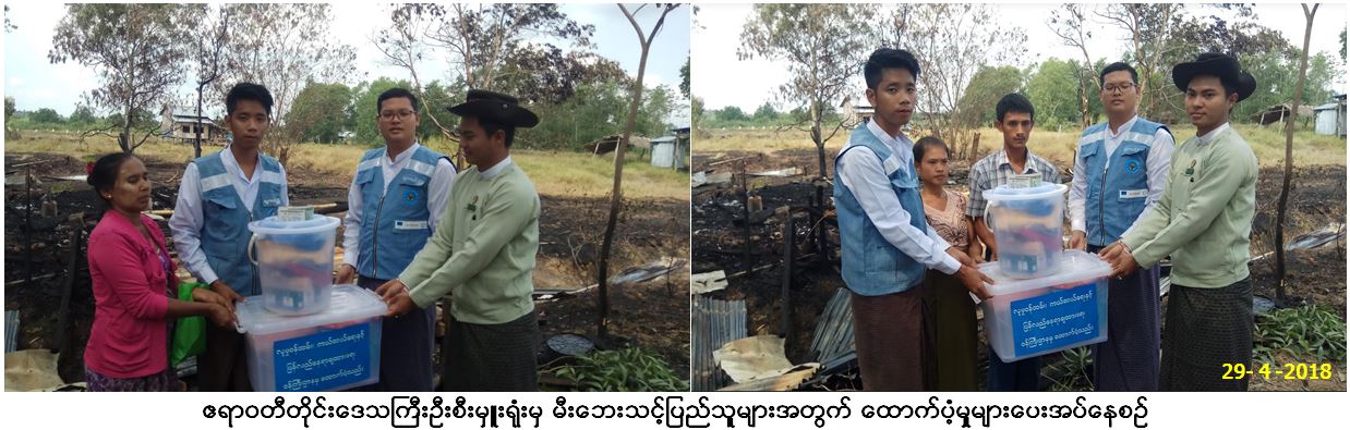 ဘေးအန္တရာယ်ဆိုင်ရာစီမံခန့်ခွဲမှုဦးစီးဌာန၊ ဧရာဝတီတိုင်းဒေသကြီးဦးစီးမှူးရုံးမှ တာဝန်ရှိသူများသည် ဧရာဝတီတိုင်းဒေသကြီး၊ ပုသိမ်မြို့နယ်၊ အမှတ်(၁၄)ရပ်ကွက်၊ ပန်းဆက်လမ်းမကြီး(၆/၇) လမ်းကြား၊ ကွင်းအမှတ်(၇၄/၇၅)၊ သပြုချောင်းကွင်းတွင် (၂၈-၄-၂၀၁၈)ရက်နေ့၌ ဖြစ်ပွားခဲ့သော မီးဘေးကြောင့် မီးလောင်ကျွမ်းပျက်စီးခဲ့သည့် နေအိမ် (၂) လုံး၊ အိမ်ထောင်စု (၂) စုမှ လူဦးရေ (၄) ဦး အတွက် Family Kits (၂၆)မျိုးပါ (၂)ပုံး (၁၆၄၀၀၀ိ/-) ၊ ပလပ်စတစ်ပုံး (၂)ပုံး (၁၂၀၀၀ိ/-) ၊ ဆန်ရိက္ခာ (၇)ရက်စာရန်ပုံငွေ (၈၄၀၀ိ/-)၊ အိမ်ဆောက်ပစ္စည်းဖိုးရန်ပုံငွေ (၃၀၀၀၀၀ိ/-)နှင့် မီးဘေးသင့်ဘုန်းတော် ကြီးကျောင်း ဆွမ်းစားဆောင်(၁)ဆောင်အတွက် ရန်ပုံငွေ (၃၀၀၀၀၀ိ/-)၊ စုစုပေါင်းရန်ပုံငွေ (၆၀၈၄၀၀ိ/-)တို့အား (၂၉-၄-၂၀၁၈)ရက်နေ့တွင် မီးဘေးသင့်ပြည်သူများ၏ လက်ဝယ် အရောက် ကွင်းဆင်းထောက်ပံ့ပေးအပ်ခဲ့ကြောင်း သတင်းရရှိပါသည်။