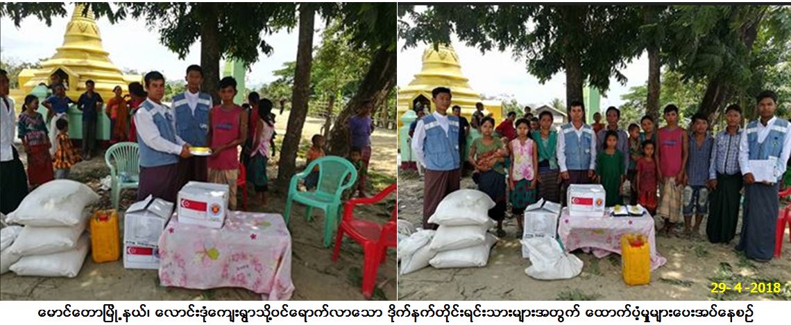 ဘေးအန္တရာယ်ဆိုင်ရာစီမံခန့်ခွဲမှုဦးစီးဌာန၊ မောင်တောခရိုင်ဦးစီးမှူးရုံးမှ တာဝန်ရှိသူများသည် (၂၂-၄-၂၀၁၈)ရက်နေ့တွင် ဘင်္ဂလား ဒေ့ရှ်နိုင်ငံမှ မောင်တောမြို့နယ်၊ လောင်းဒုံကျေးရွာသို့ဝင်ရောက်လာသော ဒိုက်နက်တိုင်းရင်းသား အိမ်ထောင်စု(၃)စု လူဦးရေ (၁၁)ဦး အတွက် ကျားလုံချည်(၃)ထည် မလုံချည်(၃)ထည် တီရှပ်(၆)ထည် ဆပ်ပြာ(၆)တောင့် မီးဖိုချောင်းသုံးပစ္စည်း(၃)ပုံး၊ စားနပ်ရိက္ခာ (၁)လစာ ဆန်(၃)အိတ် (၁၀)ပြည် (၄)ဘူး၊ ဆီ(၄.၁၂၅)ပိဿာ၊ ပဲ(၁၆.၅)ပိဿာ၊ ဆား(၈၂.၅)ကျပ်သားတို့အား (၂၉-၄-၂၀၁၈)ရက် နေ့တွင် သွားရောက်ထောက်ပံ့ပေးခဲ့ကြောင်း သတင်းရရှိပါသည်။