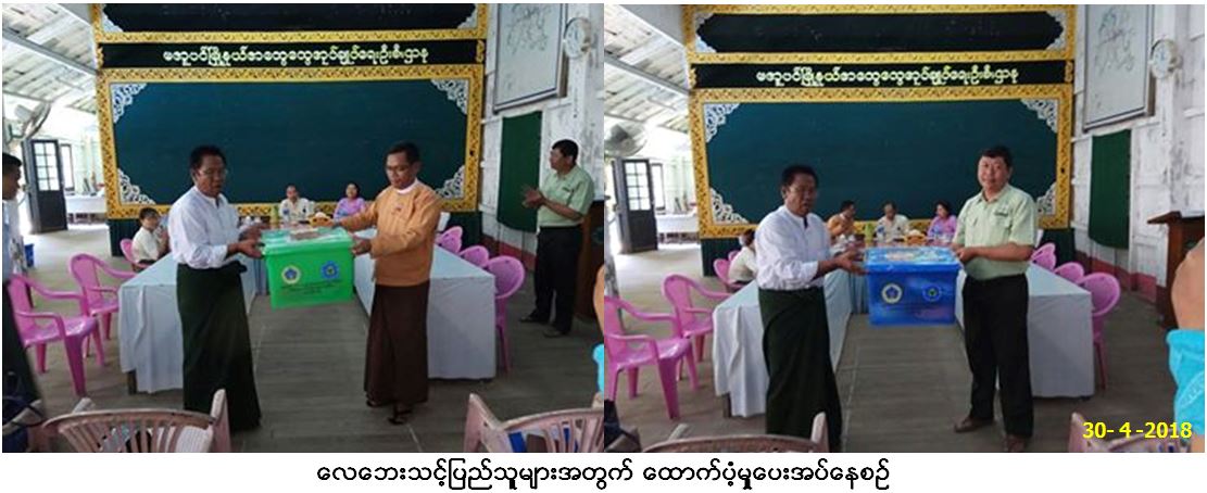 ဘေးအန္တရာယ်ဆိုင်ရာစီမံခန့်ခွဲမှုဦးစီးဌာန၊ မအူပင်ခရိုင်ဦးစီးမှူးရုံးမှ တာဝန်ရှိသူများသည် မအူပင်မြို့နယ်၊ သောင်ဇားကျေးရွာအုပ်စု၊ ဝက်ကျွန်းကျေးရွာတွင် (၂၄.၄.၂၀၁၈)ရက်နေ့ ဖြစ်ပွားခဲ့သော လေဘေးကြောင့် ပြိုကျနေအိမ်(၂)လုံး၊ အိမ်ထောင်စု(၂)စုအတွက် ကယ်ဆယ်ရေးပစ္စည်း (၁၆)မျိုး၊ အိမ်ဆောက်ပစ္စည်းဖိုး ရန်ပုံငွေ(၂၀၀၀၀၀ိ/-)တစိတ်တပိုင်းပျက်စီးဆုံးရှုံးနေအိမ်(၇)လုံး၊ အိမ်ထောင်စု(၇)စုအတွက် ကယ်ဆယ်ရေးပစ္စည်း (၁၀)မျိုး၊ အိမ်ဆောက်ပစ္စည်းဖိုးရန်ပုံငွေ (၂၁၀၀၀၀ိ/-)လူဦးရေ ကျား(၂၁)ဦး၊ မ(၂၀)ဦး၊ စုစုပေါင်းလူဦးရေ (၄၁)ဦးအတွက် ဆန်ရိက္ခာဖိုးရန်ပုံငွေ(၈၆၁၀၀ိ/-)စုစုပေါင်း ကယ်ဆယ်ရေးရန်ပုံငွေ (၄၉၆၁၀၀ိ/-)(ကျပ်လေး သိန်းကိုးသောင်းခြောက်ထောင့်တစ်ရာတိတိ)တို့အား တိုင်းဒေသကြီးလွှတ်တော်ကိုယ်စားလှယ်၊ မအူပင်ခရိုင်/မြို့နယ်၊ ထွေ/အုပ်မှ တာဝန်ရှိသူများနှင့်အတူ (၃၀.၄.၂၀၁၈)၇က်နေ့တွင် ထောက်ပံ့ပေးအပ်ခဲ့ကြောင်း သတင်းရရှိပါသည်။