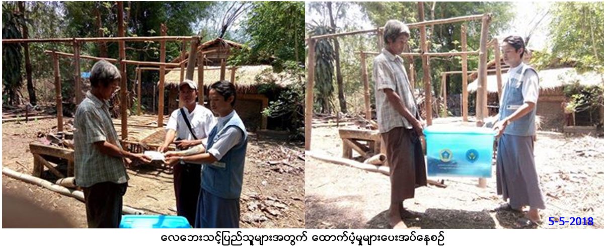 ဘေးအန္တရာယ်ဆိုင်ရာစီမံခန့်ခွဲမှုဦးစီးဌာန၊ ဟင်္သာတခရိုင်ဦးစီးမှူးရုံးမှ တာဝန်ရှိသူများသည် မြန်အောင်မြို့နယ်၊ ကွမ်းတောအုပ်စုအတွင်းရှိ အလယ်ကုန်းကျေးရွာတွင်(၂၈.၄.၂၀၁၈)နေ့၌ လေဘေးဖြစ်ပွားမှုကြောင့် လေဘေးဒဏ်ခံစား ခဲ့ရသော အိမ်ခြေပြိုကျပျက်စီး(၁)လုံး(ဝါးအိမ်)၊ အိ်မ်ထောင်စု(၁)စု၊ လူဦးရေ (၁)ဦးအတွက် (၃၇၃၅၃)ကျပ်တန်ဖိုးရှိသော ကယ်ဆယ်ရေးပစ္စည်း (၁၆)မျိုး၊ (၁) အိမ်ထောင်စာကိုလည်းကောင်း၊ ၊အိမ်ဆောက်ပစ္စည်းဖိုး (၁၀၀၀၀၀)ကျပ်၊ ဆန်ရိက္ခာဖိုး (၂၁၀၀)ကျပ်၊ စုစုပေါင်းကယ်ဆယ်ရေး ရန်ပုံငွေ(၁၀၂၁၀၀)ကျပ်တို့ကို လည်းကောင်း (၅-၅-၂၀၁၈)ရက်နေ့တွင် ဘေးဖြစ်ပွားသည့်နေရာ သို့ ကွင်းဆင်းကာ ဘေးသင့်ပြည်သူများ၏ လက်ဝယ်အရောက် ထောက်ပံ့ပေးအပ်ခဲ့ ကြောင်း သတင်းရရှိပါသည်။