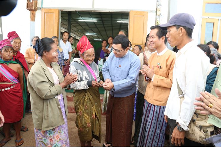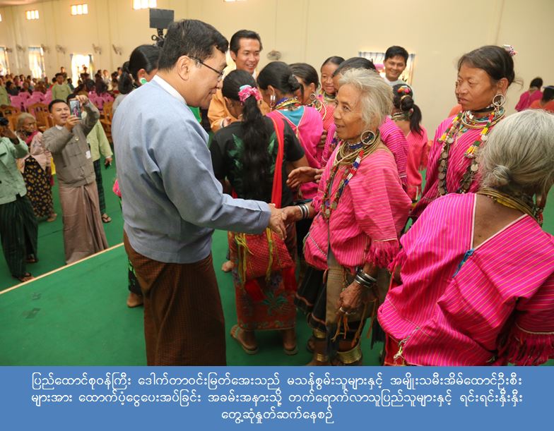 ဆက်လက်၍ ပြည်ထောင်စုဝန်ကြီးနှင့်အဖွဲ့သည် ကယားပြည်နယ်၊ ဒီးမော့ဆိုမြို့နယ်တွင် ကျင်းပပြုလုပ်သည့် ပြန်လည်ထူထောင်ရေးနှင့် ဖွံ့ဖြိုးတိုးတက်ရေးလုပ်ငန်းများကို ရည်ရွယ် ဆောင်ရွက် သည့် မသန်စွမ်းသူများနှင့် အမျိုးသမီးအိမ်ထောင်ဦးစီးများအား ထောက်ပံ့ငွေပေးအပ်ခြင်း အခမ်းအနားသို့ တက်ရောက်၍ ပြည်ထောင်စုဝန်ကြီးက ယခုအစိုးသစ်လက်ထက်၌ တိုင်းရင်းသားအရေးနှင့် ပြည်တွင်း ငြိမ်းချမ်းရေးကို ဦးစားပေးဆောင်ရွက်လျက်ရှိရာ ပြည်နယ်များဖွံ့ဖြိုးတိုးတက်ရေးကို အလေးထား ဆောင်ရွက်လျက်ရှိပါကြောင်း၊ ထိုသို့ ဆောင်ရွက်ရာတွင် ငြိမ်းချမ်းရေးကြိုးပမ်းမှုသည် အရေးပါကြောင်း၊ ငြိမ်းချမ်းရေးကို ဖေါ်ဆောင်ရာတွင် ပြည်သူ့အင်အားသည် အဓိကကျပါကြောင်း၊ ငြိမ်းချမ်းရေးရရှိပါက ယခုလက်ရှိဖွံ့ဖြိုးတိုးတက်မှုဆောင်ရွက်ခြင်းထက် အဆပေါင်းများစွာ ဆောင်ရွက်ပေးနိုင်မည် ဖြစ်ပါ ကြောင်း၊ ငြိမ်းချမ်းရေးမတည်ဆောက်နိုင်စဉ်ကာလအတွင်း ပဋိပက္ခမြောက်မြားစွာကြောင့် ပြည်သူလူထု ထိခိုက်မှုဖြစ်စဉ်များ ကြုံတွေ့ခဲ့ရပါကြောင်း၊ ထိုဖြစ်စဉ်များတွင် မိုင်းကြောင့် မသန်စွမ်းဖြစ်ခဲ့ရသည့် အခြေအနေများရှိခဲ့ပါကြောင်း၊ မသန်စွမ်းများသည် မသန်သော်လည်း စွမ်းနေကြသူများ ဖြစ်သည့် အတွက် ၄င်းတို့၏အစွမ်းကို ပံ့ပိုးကူညီပေးပါက ဘဝရပ်တည်မှုနှင့် ဖွံ့ဖြိုးတိုးတက်မှုအတွက် ပိုမိုစွမ်းဆောင် လာနိုင်မည်ဖြစ်ကြောင်း၊ မြန်မာနိုင်ငံတွင် အမျိုးသမီး များသည် အရေးပါသောကဏ္ဍမှ ပါ၀င်လျက်ရှိပြီး အမျိုးသမီးများက ဦးဆောင်နေရသည့် အိမ်ထောင်စုများတွင် အခက်အခဲများစွာရင်ဆိုင်နေရသဖြင့် ပံ့ပိုးမှုပြုရန်လိုအပ်ပါကြောင်း ပြောကြားခဲ့ပါသည်။ ထို့နောက် ဒီးမော့ဆိုမြို့နယ်တွင် မသန်စွမ်းသူ များအတွက် ထောက်ပံ့ကြေးငွေ (၂၄၅)သိန်းနှင့် အမျိုးသမီးအိမ်ထောင်ဦးစီးများအတွက် ထောက်ပံ့ကြေး ငွေ(၁၆၈)သိန်းတို့အား ပေးအပ်ထောက်ပံ့ခဲ့ပြီး ဒေသခံတိုင်းရင်းသူတစ်ဦးမှ ကျေးဇူးတင်စကား ပြန်လည်ပြောကြားခဲ့ပါသည်။ ပြည်ထောင်စုဝန်ကြီးက အခမ်းအနားတက်ရောက်လာကြသော ပြည်သူများနှင့် ရင်းရင်းနှီးနှီးတွေ့ဆုံနှုတ်ဆက်ကာ မှတ်တမ်းတင်ဓါတ်ပုံရိုက်ကူးခဲ့ကြပါသည်။