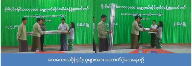 ဘေးအန္တရာယ်ဆိုင်ရာစီမံခန့်ခွဲမှုဦးစီးဌာန၊ မိုးမိတ်မြို့နယ်ဦးစီးမှူးရုံးမှ တာဝန်ရှိသူများသည် မိုးမိတ်ခရိုင်အတွင်း (၉-၅-၂၀၁၈)နေ့တွင်ဖြစ်ပွားခဲ့သော လေဘေးသင့် အမိုးလန်အိမ်(၃)လုံးနှင့် ဓမ္မာရုံ(၁)လုံးအတွက် အိမ်ဆောက်ပစ္စည်းဖိုးငွေ(၄၀၀,၀၀၀)ကျပ်အား မိုးမိတ်မြို့နယ် အထွေထွေ အုပ်ချုပ်ရေးဦးစီးဌာနခရိုင် အုပ်ချုပ်ရေးမှူး မြို့နယ်အုပ်ချုပ်ရေးမှူးတို့နှင့် ခရိုင်/မြို့နယ် သဘာဝဘေးစီမံခန့်ခွဲမှု ကော်မတီအဖွဲ့ တို့နှင့််အတူ (၁၂-၅-၂၀၁၈) ရက်နေ့တွင်ထောက်ပံ့ပေးအပ်ခဲ့ပါ ကြောင်းနှင့် မဘိမ်းမြို့နယ် လေဘေးသင့် အမိုးလန်နေအိမ် (၈) လုံးနှင့် ပြိုကျနေအိမ်(၂)လုံးအတွက် ထောက်ပံ့ငွေ (၆၉၄,၀၀၀)ကျပ်နှင့် ကယ်ဆယ်ရေးပစ္စည်း(၁၀)မျိုး အိမ်ထောင်စု(၂)စုစာအား မဘိမ်းမြို့နယ်အထွေထွေအုပ်ချုပ်ရေးဦးစီးဌာနမှတဆင့် ထောက်ပံ့ပေးအပ်ခဲ့ ကြောင်း သိရှိရပါသည်။