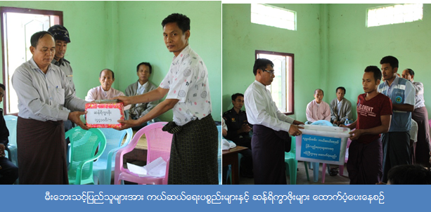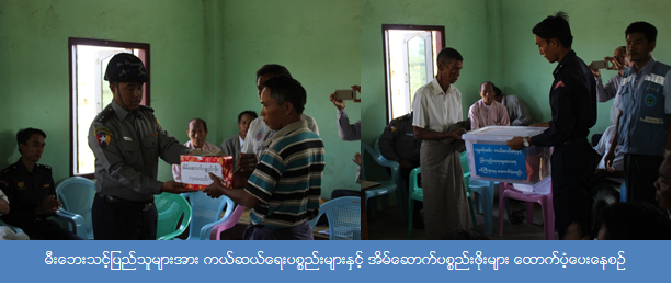 ဘေးအန္တရာယ်ဆိုင်ရာစီမံခန့်ခွဲမှုဦးစီးဌာန၊ ပခုက္ကူခရိုင်ဦးစီးမှူးရုံးမှ တာဝန်ရှိသူများသည် မြိုင်မြို့နယ်၊ ဆူးဝင်း ကျေးရွာအုပ်စု၊ ကျောက်ခွက်ကျေးရွာတွင် (၁၁-၅-၂၀၁၈) ရက်နေ့တွင် ဖြစ်ပွားခဲ့သော မီးဘေးကြောင့် မီးဘေးသင့် အိမ်ခြေ(၅)လုံး၊ အိမ်ထောင်စု(၅)စု၊ ဘေးသင့်လူဦးရေ(၂၁)ဦး ဘေးသင့်ခဲ့သဖြင့် အိမ်ဆောက်ပစ္စည်းဖိုး (၇၀၀,၀၀၀) ကျပ်၊ ဆန်ရိက္ခာဖိုး (၄၄,၁၀၀)ကျပ်၊ ကယ်ဆယ်ရေးပစ္စည်း (၁၅)မျိုး၊ စုစုပေါင်း (၇၄၄,၁၀၀) (ကျပ်ခုနှစ်သိန်း လေးသောင်းလေးထောင့်တစ်ရာတိတိ) တို့အား (၁၂-၅-၂၀၁၈) ရက်နေ့တွင် မြိုင်မြို့နယ် တိုင်းဒေသကြီး(၁) လွှတ်တော်ကိုယ်စားလှယ် ဦးသက်နိုင်၊ မြိုင်မြို့နယ် အထွေထွေအုပ်ချုပ်ရေးဦးစီးဌာနမှ မြို့နယ်အုပ်ချုပ်ရေးမှူး ဦးသိန်းစိုးနှင့် ဌာနဆိုင်ရာများ၊ အနာဂတ်အလင်း ရောင်လူငယ်ဖွံ့ဖြိုးရေးအသင်း ဥက္ကဌ ဦးရဲထွဋ်တို့နှင့်အတူ ဘေးသင့်ပြည်သူများ၏ လက်ဝယ် အရောက် ထောက်ပံ့ပေးအပ်ခဲ့ကြောင်း သိရှိရပါသည်၊၊