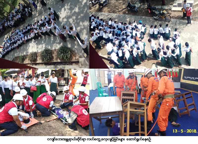 ဘေးအန္တရာယ်ဆိုင်ရာစီမံခန့်ခွဲမှုဦးစီးဌာန၊ ဧရာဝတီတိုင်းဒေသကြီးဦးစီးမှူးရုံးမှ တာဝန်ရှိသူများသည် မီးသတ် ဦးစီးဌာန၊ ဧရာဝတီတိုင်းဒေသကြီး ကြက်ခြေနီအသင်းတို့နှင့် ပူးပေါင်း၍ (၁၃-၅-၂၀၁၈) ရက်နေ့တွင် ဧရာဝတီ တိုင်းဒေသကြီး၊ ပုသိမ်မြို့၊ အမှတ် (၁) အခြေခံပညာအထက်တန်းကျောင်း၊ ရတနာတန်ဆောင်ခန်းမ၌ (၀၈း၀၀) အချိန်မှ (၁၁း၃၀) နာရီအချိန်အထိ ပုသိမ်မြို့နယ်၊ ဒုတိယတန်းသင်ရိုးညွှန်းတန်းသစ် မွမ်းမံသင်တန်း တက်ရောက်လျက်ရှိသည့် ဆရာ/ဆရာမ (၄၈၀) ဦးအားလည်းကောင်း၊ (၁၄း၀၀) အချိန်မှ (၁၆း၀၀) နာရီ အချိန်ထိ ဆရာ/ဆရာမ (၄၁၀) ဦးအားလည်းကောင်း ငလျင်ဘေးအန္တရာယ်ဆိုင်ရာ အသိပညာပေးဆွေးနွေး ပွဲနှင့် လက်တွေ့လေ့ကျင့်ခြင်းများကို ဆောင်ရွက်ခဲ့ပါကြောင်း သတင်းရရှိပါသည်။