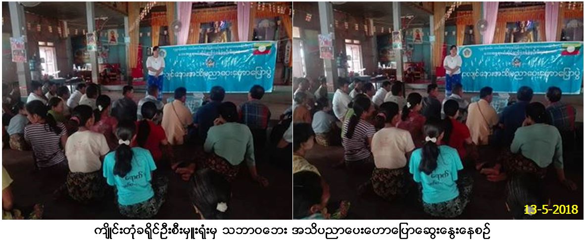 ဘေးအန္တရာယ်ဆိုင်ရာစီမံခန့်ခွဲမှုဦးစီးဌာန၊ ကျိုင်းတုံခရိုင်ဦးစီးမှူးရုံးမှ တာဝန်ရှိသူများသည် (၁၃.၅.၂၀၁၈)ရက်နေ့ နံနက် (၀၈:၃၀)နာရီမှ (၀၉း၃၀)နာရီထိ မိုင်းတုံမြို့နယ်၊ ဝမ်မိုင်ရပ်ကွက်တွင် တက်ရောက်သူ (၆၀)ဦးအား သဘာဝဘေး အသိပညာပေးဟောပြောဆွေးနွေးခြင်း၊ ငလျင်၊ ငလျင်လှုပ်ခတ်စဉ်အတွင်းဘေးနှင့်ပတ်သက်၍ ဆောင်ရန်ရှောင်ရန်များ နေထိုင်ရမည့်အနေအထား အား လက်တွေ့သရုပ်ပြခြင်း၊ လက်ကမ်း စာစောင်ဖြန့်ဝေပေးခြင်းများဆောင်ရွက်ခဲ့ကြောင်း သတင်းရရှိပါသည်။