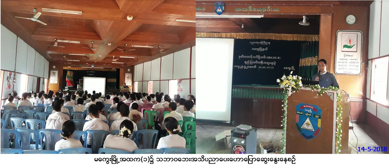ဘေးအန္တရာယ်ဆိုင်ရာစီမံခန့်ခွဲမှုဦးစီးဌာန၊ မကွေးတိုင်းဒေသကြီးဦးစီးမှူးရုံးမှ တာဝန်ရှိသူများသည် (၁၄.၅.၂၀၁၈)ရက်နေ့ (၀၉း၀၀)နာရီအချိန် ၌မကွေးမြို့၊ အထက(၁)၌ ဒုတိယတန်းသင်ရိုးသစ်(Grade-2)နည်းပြသင်တန်းမှ ဆရာ၊ ဆရာမအင်အား(၂၄၅)ဦးအား သဘာဝဘေးစီမံခန့်ခွဲ မှုလုပ်ငန်းများ၊ ငလျင်အကြောင်း သိကောင်းစရာများဟောပြောဆွေးနွေးခဲ့ပြီး ဘေး(၈)မျိုးလက်ကမ်းစာစောင်များဖြန့်ဝေပေးခဲ့ကြောင်း သတင်း ရရှိပါသည်။