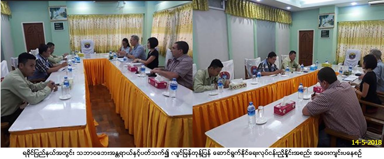 (၁၄-၅-၂၀၁၈)ရက် (၁၀း၃၀)နာရီအချိန်တွင် ရခိုင်ပြည်နယ်၊ စစ်တွေမြို့၊ ရခိုင်ပြည်နယ်အစိုးရအဖွဲ့ရုံး၌ ရခိုင်ပြည်နယ်အစိုးရအဖွဲ့မှ ညွှန်ကြား ရေးမှူး ဦးကျော်စွာထွန်း၊ ဘေးအန္တရာယ်ဆိုင်ရာစီမံခန့်ခွဲမှုဦးစီးဌာန၊ ရခိုင်ပြည်နယ်ဦးစီးမှူးရုံးမှ ပြည်နယ်မှူးဦးကျော်မင်းနှင့် အစိုးရအဖွဲ့မှ လက်ထောက်ညွှန်ကြားရေးမှူး မင်းစိုးနိုင်တို့သည် UNOCHA,UNHCR,IOM အဖွဲ့အစည်းတို့မှ တာဝန်ရှိသူများနှင့် ရခိုင်ပြည်နယ်အတွင်း သဘာဝဘေးအန္တရာယ်နှင့်ပတ်သက်၍ လျင်မြန်တုန့်ပြန် ဆောင်ရွက်နိုင်ရေးလုပ်ငန်းကိစ္စရပ်များအား ညှိနှိုင်းအစည်းအဝေးကျင်းပပြုလုပ်ခဲ့ ကြောင်း သတင်းရရှိပါသည်။