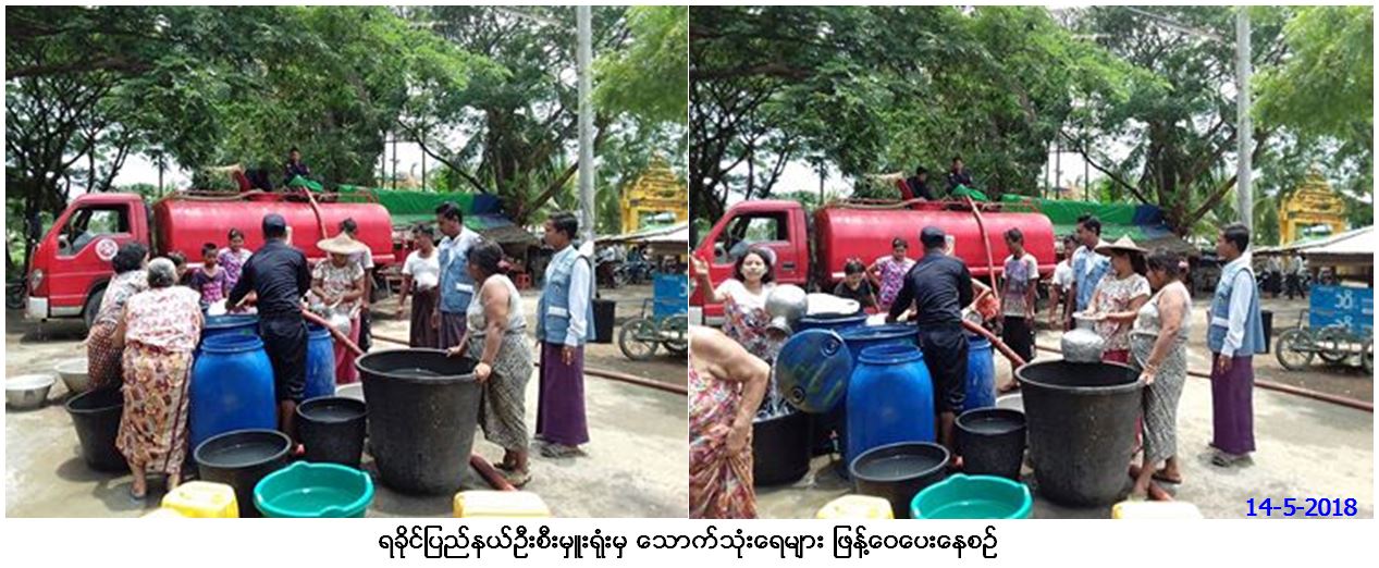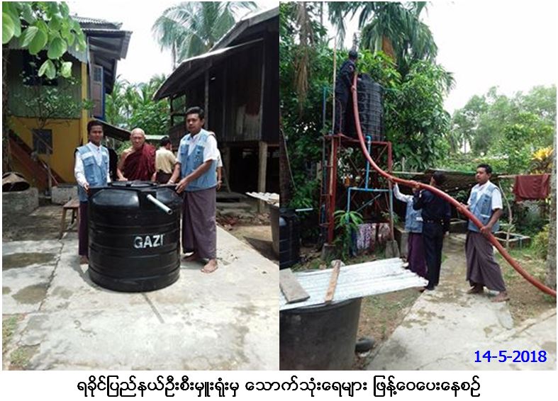 ဘေးအန္တရာယ်ဆိုင်ရာစီမံခန့်ခွဲမှုဦးစီးဌာန၊ ရခိုင်ပြည်နယ်ဦးစီးမှူးရုံးမှ တာဝန်ရှိသူများသည် (၁၄-၅-၂၀၁၈)ရက်နေ့တွင် စစ်တွေမြို့၊ ရွာကြီး မြောက်ရပ်ကွက်၊ ဓမ္မရောင်ခြည်ဘုန်းတော်ကြီးကျောင်းအတွက် GAZI ရေပုံး(၁)လုံး သွားရောက်ထောက်ပံ့လှူဒါန်းခဲ့ပြီး ရပ်ကွက်နေ ရွာသူ/သားများအား သောက်သုံးရေဖြန့်ဝေပေးခြင်းအား မီးသတ်ဦးစီးဌာနနှင့်အတူပူးပေါင်းဆောင်ရွက်ခဲ့ကြောင်း သတင်းရရှိပါသည်။