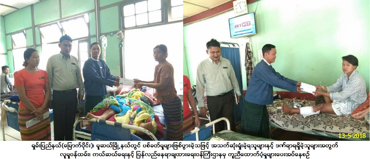 ရှမ်းပြည်နယ်(မြောက်ပိုင်း)၊ မူဆယ်မြို့နယ်၊ ပန်ခန်းကျေးရွာအုပ်စု၊ မန့်ပိန်းရပ်ကွက်တွင်(၁၂-၅-၂၀၁၈)ရက်နေ့နံနက် (၅)နာရီ (၁၅)မိနစ် ခန့်တွင် ကေအိုင်အေ/တီအန်အယ်လ်အေလက်နက်ကိုင် အဖွဲ့၏ ပစ်ခတ်မှုကြောင့် ရဲတပ်ဖွဲ့ဝင်(၁)ဦး၊ ပြည်သူ့စစ်(၄)ဦး၊ ပြည်သူ (၁၄)ဦး စုစုပေါင်း(၁၉)ဦး သေဆုံးခဲ့ပြီး ရဲတပ်ဖွဲ့ဝင်နှင့် ပြည်သူ(၂၇)ဦးတို့ ဒဏ်ရာရရှိခဲ့သဖြင့် လူမှုဝန်ထမ်း၊ ကယ်ဆယ်ရေးနှင့် ပြန်လည်နေရာချ ထားရေးဝန်ကြီးဌာန၊ ဘေးအန္တရာယ်ဆိုင်ရာစီမံခန့်ခွဲမှုဦးစီးဌာန၊ လားရှိုးခရိုင်ဦးစီးမှူးရုံးမှ တာဝန်ရှိသူများသည် (၁၃-၅-၂၀၁၈)ရက်နေ့တွင် မူဆယ်မြို့သို့ရောက်ရှိပြီး ထောက်ပံ့မှုများ ဆောင်ရွက်လျှက်ရှိရာ ယနေ့ဆက်လက်၍ သေဆုံးသူ(၁၇)ဦးအတွက် တစ်ဦးလျှင် (၃၀၀,၀၀၀ိ/-) (ကျပ်သုံးသိန်းတိတိ)နှုန်းဖြင့် (၅,၁၀၀,၀၀၀ိ/-) (ကျပ်ငါးဆယ့်တစ်သိန်းတိတိ)၊ ဒဏ်ရာရသူ(၂၄)ဦးအတွက် တစ်ဦးလျှင် (၅၀,၀၀၀ိ/-)နှုန်းဖြင့် (၁,၂၀၀,၀၀၀ိ/-) (ကျပ်တစ်ဆယ့်နှစ်သိန်းတိတိ) စုစုပေါင်းငွေကျပ် (၆,၃၀၀,၀၀၀ိ/-) (ကျပ်ခြောက်ဆယ့်သုံးသိန်းတိတိ)အား ထောက်ပံ့ပေးခဲ့ ကြောင်း သတင်းရရှိပါသည်။