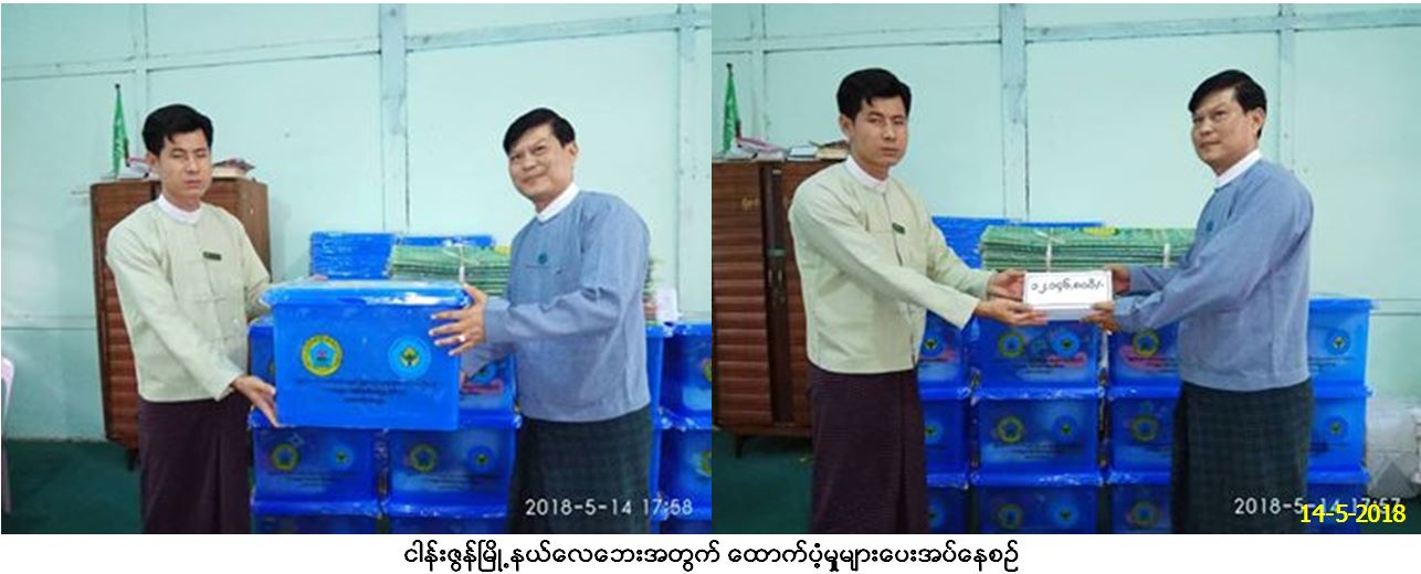 ဘေးအန္တရာယ်စီမံခန့်ခွဲမှုဦးစီးဌာန၊ မန္တလေးတိုင်းဒေသကြီးဦးစီးမှူးရုံးမှ တာဝန်ရှိသူများသည် ငါန်းဇွန်မြို့နယ်အတွင်း (၁၁-၅-၂၀၁၈)ရက်နေ့ ဖြစ်ပွားသော လေဘေးကြောင့် ပြိုကျအိမ်ခြေ(၁၂)လုံး၊ တစိတ်တပိုင်းပျက်စီး(၁၈၇)လုံးအတွက် အိမ်ဆောက်ပစ္စည်းဖိုးနှင့် ဆန်ရိက္ခာဖိုး ကျပ်ငွေ(၁၂၁၄၆၈၀၀ိ/-)တိတိ အား (၁၄.၅.၂၀၁၈)ရက်နေ့တွင် သွားရောက်ထောက်ပံ့ခဲ့ပါသည်။