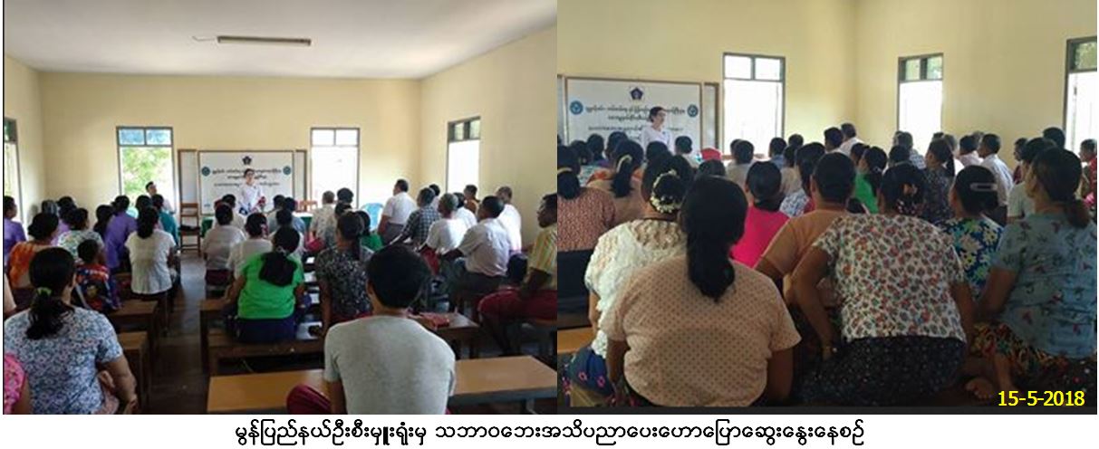 ဘေးအန္တရာယ်ဆိုင်ရာစီမံခန့်ခွဲမှုဦးစီးဌာန၊ မွန်ပြည်နယ်ဦးစီးမှူးရုံးမှ တာဝန်ရှိသူများသည် (၁၅.၅.၂၀၁၈) ရက်နေ့၊ (၁၀း၀၀)နာရီအချိန်တွင် ကျိုက်မရောမြို့နယ်၊ ကျွန်းရွာကျေးရွာ၌ ကျေးရွာနေပြည်သူ (၁၀၀)ဦးအား သဘာဝဘေးအသိပညာပေးဟောပြောဆွေးနွေးခဲ့ပြီး သဘာဝဘေး အသိပညာပေးလက်ကမ်းစာစောင်များဝေငှပေးခဲ့ကြောင်း သတင်းရရှိပါသည်။