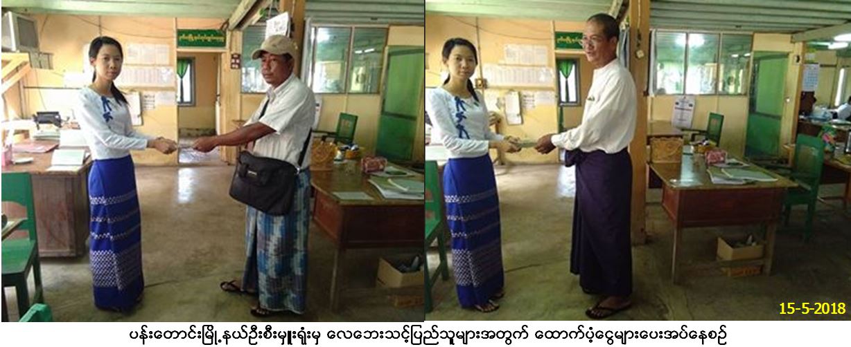 ဘေးအန္တရာယ်ဆိုင်ရာစီမံခန့်ခွဲမှုဦးစီးဌာန၊ ပြည်ခရိုင်၊ ပန်းတောင်းမြို့နယ်ဦးစီးမှူးရုံးမှ တာဝန်ရှိသူများသည် (၁၂.၅.၂၀၁၈) ရက်နေ့ လေးပြင်း တိုက်ခတ်မှုကြောင့် ပန်းတောင်းမြို့နယ်၊ ကျေးရွာအုပ်စု(၄)စု ကျေးရွာ(၇)ရွာမှ အမိုးလန်နေအိမ် (၈)လုံးအတွက် အိမ်ဆောက်ပစ္စည်းဖိုး ထောက်ပံ့ငွေ (၄၈၈၈၅၀ိ/-)ကျပ်အား ပန်းတောင်းမြို့နယ်အထွေထွေအုပ်ချုပ်ရေးဦးစီးဌာနရုံး၌ ကျေးရွာအုပ်ချုပ်ရေးမှူးများနှင့်အတူ (၁၅.၅.၂၀၁၈)ရက်နေ့ (၁၄း၀၀)နာရီအချိန်တွင် လေဘေးသင့်ပြည်သူများထံသို့ ထောက်ပံပေးအပ်ခဲ့ကြောင်း သတင်းရရှိပါသည်။
