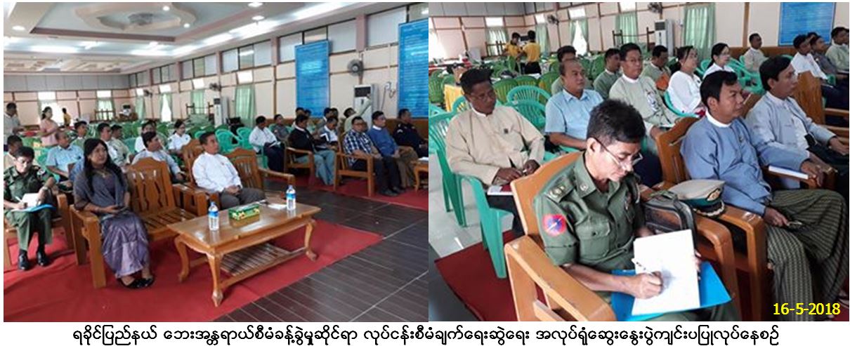 (၁၆-၅-၂၀၁၈)ရက်နေ့(၀၉း၀၀)နာရီအချိန်တွင် စစ်တွေမြို့၊ မင်းသူရိယခန်းမ၌ ရခိုင်ပြည်နယ်ဦးစီးမှူးရုံး (ဘစမ)နှင့် IOM အဖွဲ့အစည်းတို့ပူး ပေါင်း၍ ကျင်းပပြုလုပ်သည့် ရခိုင်ပြည်နယ် ဘေးအန္တရာယ်စီမံခန့်ခွဲမှုဆိုင်ရာ လုပ်ငန်းစီမံချက်ရေးဆွဲရေး အလုပ်ရုံဆွေးနွေးပွဲတွင် ပြည်နယ် လူမှုရေးဝန်ကြီးဒေါက်တာချမ်းသာကိုယ်စား ပြည်နယ်စီးပွားရေး၊ မွေးမြူရေး၊ သစ်တောနှင့် သတ္တုဝန်ကြီး ဦးကျော်လွင်မှ အဖွင့်အမှာစကား ပြောကြားပြီး ရခိုင်ပြည်နယ်ဦးစီးမှူး(ဘစမ)မှ အလုပ်ရုံဆွေးနွေးပွဲနှင့်ပတ်သက်၍ ရှင်းလင်းပြောကြားခဲ့ပါသည်။ အလုပ်ရုံဆွေးနွေးပွဲသို့ ပြည်နယ်သဘာဝဘေးအန္တရာယ်စီမံခန့်ခွဲမှုကော်မတီဝင် (၃၀)ဦးတက်ရောက်ခဲ့ပြီး အလုပ်ရုံဆွေးနွေးပွဲကာလမှာ (၁၆-၅-၂၀၁၈)ရက်မှ(၁၇-၅-၂၀၁၈)ရက်ထိ (၂)ရက်တာကြာမြင့်မည်ဖြစ်ကြောင်း သတင်းရရှိပါသည်။