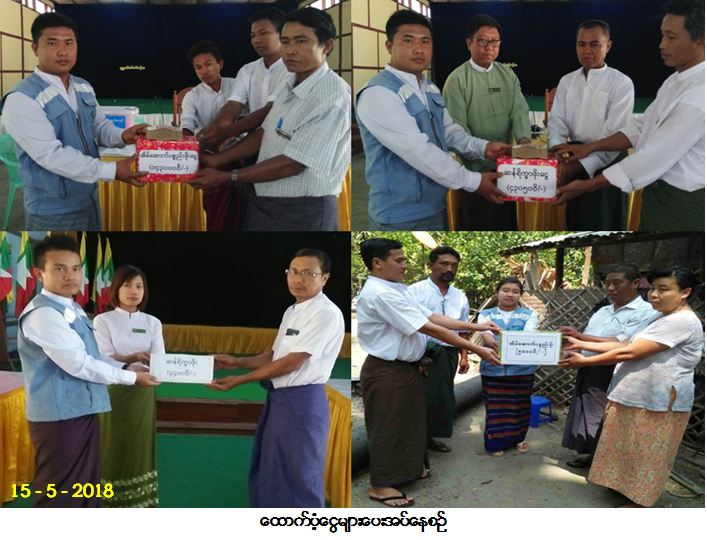 ဘေးအန္တရာယ်ဆိုင်ရာစီမံခန့်ခွဲမှုဦးစီးဌာန၊ ပခုက္ကူခရိုင်ဦးစီးမှူးရုံးမှ တာဝန်ရှိသူများ၊ ရေစကြိုမြို့နယ် ဦးစီး မှူးရုံးမှ တာဝန်ရှိသူများနှင့် ဆိပ်ဖြူမြို့နယ်ဦးစီးမှူးရုံးမှ တာဝန်ရှိသူများသည်သည် ပခုက္ကူခရိုင်၊ ပခုက္ကူ မြို့နယ်အတွင်းရှိ ကျေးရွာအုပ်စု (၁၆) အုပ်စု၊ကျေးရွာ (၂၉) ရွာတို့တွင် (၁၁/၁၃-၅-၂၀၁၈)ရက်နေ့တို့တွင် ဖြစ်ပွားခဲ့သော လေပြင်းတိုက်ခတ်မှုကြောင့် ပြိုကျအိမ်ခြေ (၈) လုံး၊ အမိုးလန်အိမ်ခြေ (၁၁၉) လုံး၊ အိမ်ထောင်စု (၁၂၇) စု၊ လူဦးရေ (၅၈၄) ဦးတို့အတွက် အိမ်ဆောက်ပစ္စည်ဖိုးငွေ (၃,၈၂၀,၀၀၀ိ/-) ကျပ်၊ ဆန်ရိက္ခာဖိုးငွေ (၇) ရက်စာ (၁,၂၂၆,၄၀၀ိ/-) ကျပ်၊ ပြိုကျအိမ်ခြေ (၈) လုံးအတွက် ကယ်ဆယ်ရေးပစ္စည်း (၁၅) မျိုး၊(၈) အိမ်ထောင်စာ၊ အမိုးလန်အိမ်ခြေ(၁၁၉)လုံးအတွက် ကယ်ဆယ်ရေးပစ္စည်း (၉) မျိုး၊ (၁၁၉) အိမ်ထောင်စာ၊ စုစုပေါင်း (၅,၀၄၆,၄၀၀ိ/-)ကျပ်တို့အား မြို့နယ်အထွေထွေအုပ်ချုပ်ရေးဦးစီး ဌာနမှ တာဝန်ရှိသူများနှင့်အတူ ဘေးသင့်ပြည်သူများ လက်ဝယ်အရောက်ထောက်ပံ့ပေးခြင်းအားလည်းကောင်း၊ ပေါက်မြို့နယ် အတွင်းရှိ ကျေးရွာအုပ်စု (၆) အုပ်စု၊ ကျေးရွာ(၉) ရွာတို့တွင် (၁၁-၅-၂၀၁၈)ရက်နေ့တွင် ဖြစ်ပွားခဲ့သော လေပြင်းတိုက်ခတ်မှုကြောင့် ပြိုကျအိမ်ခြေ (၂) လုံး၊ အမိုးလန်အိမ်ခြေ (၄၆) လုံး၊ အိမ်ထောင်စု (၄၈) စု၊ လူဦးရေ (၂၀၅) ဦး အတွက် အိမ်ဆောက်ပစ္စည်ဖိုးငွေ (၁,၄၃၀,၀၀၀ိ/-)ကျပ်၊ ဆန်ရိက္ခာ ဖိုးငွေ (၇) ရက်စာ (၄၃၀,၅၀၀ိ/-)ကျပ်၊ ပြိုကျအိမ်ခြေ (၂) လုံးအတွက် ကယ်ဆယ်ရေးပစ္စည်း (၁၅) မျိုး၊ (၂) အိမ်ထောင်စာ၊ အမိုးလန်အိမ်ခြေ (၄၆) လုံးအတွက် ကယ်ဆယ်ရေးပစ္စည်း (၉) မျိုး၊ (၄၆) အိမ်ထောင်စာ၊ စုစုပေါင်း (၁,၈၆၀,၅၀၀ိ/-) ကျပ်တို့အား မြို့နယ်အထွေထွေအုပ်ချုပ်ရေးဦးစီးဌာနမှ တာဝန် ရှိသူများနှင့်အတူ ဘေးသင့်ပြည်သူများ လက်ဝယ်အရောက်ထောက်ပံ့ပေးခြင်းအားလည်းကောင်း၊ ရေစကြိုမြို့နယ်အတွင်းရှိ ကျေးရွာအုပ်စု (၄) စု၊ ကျေးရွာ (၅) ရွာ၊ ရပ်ကွက် (၂) ခုတို့တွင် (၁၁-၅-၂၀၁၈) ရက်နေ့တွင် လေပြင်းတိုက်ခတ်မှုကြောင့် ပြိုကျအိမ်ခြေ (၁) လုံး၊ အမိုးလန်အိမ်ခြေ (၈)လုံး၊ အိမ်ထောင်စု (၉) စု၊ လူဦးရေ (၄၃) ဦးအတွက် အိမ်ဆောက်ပစ္စည်ဖိုးငွေ (၄၀၀,၀၀၀ိ/-)ကျပ်၊ ဆန်ရိက္ခာဖိုးငွေ (၇) ရက်စာ (၉၀,၃၀၀ိ/-)ကျပ်၊ ပြိုကျအိမ်ခြေ (၁) လုံးအတွက် ကယ်ဆယ်ရေးပစ္စည်း (၁၅) မျိုး၊ (၁) အိမ်ထောင်စာ၊ အမိုးလန်အိမ်ခြေ (၈) လုံးအတွက် ကယ်ဆယ်ရေးပစ္စည်း (၉) မျိုး၊ (၈) အိမ်ထောင်စာ စုစုပေါင်း (၄၉၀,၃၀၀ိ/-)ကျပ်အား မြို့နယ်အထွေထွေအုပ်ချုပ်ရေးဦးစီးဌာနမှတာဝန်ရှိသူများနှင့်အတူ ဘေး သင့်ပြည်သူများ လက်ဝယ်အရောက်ထောက်ပံ့ပေးခြင်းအားလည်းကောင်း၊ မြိုင်မြို့နယ်အတွင်းရှိ ဆူးဝင်းကျေးရွာအုပ်စု၊ ကျောက်ခွက်ကျေးရွာတွင် (၁၁-၅-၂၀၁၈) ရက်နေ့တွင် ဖြစ်ပွားခဲ့သော မီးလောင်မ