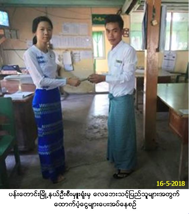 ဘေးအန္တရာယ်ဆိုင်ရာစီမံခန့်ခွဲမှုဦးစီးဌာန၊ ပြည်ခရိုင်၊ ပန်းတောင်းမြို့နယ်ဦးစီးမှူးရုံးမှ တာဝန်ရှိသူများသည် (၁၁.၅.၂၀၁၈)ရက်နေ့ လေးပြင်း တိုက်ခတ်မှုကြောင့် ပန်းတောင်းမြို့နယ်၊ ကျောင်းဦးအုပ်စုမြို့ကြီးကျေးရွာ ပြိုလဲနေအိမ် (၁)လုံး၊ အမိုးလန်နေအိမ် (၃)လုံးအတွက် အိမ်ဆောက် ပစ္စည်းဖိုးထောက်ပံ့ငွေ (၃၁၇၁၅၀ိ/-)ကျပ် ဆန်ရိက္ခာဖိုးထောက်ပံ့ငွေ (၁၂၆၀၀ိ/-)စုစုပေါင်းထောက်ပံ့ငွေ (၃၂၉၇၅၀ိ/-)နှင့် ကယ်ဆယ်ပစ္စည်း (၉)မျိုးတစ်အိမ်ထောင်စာအား ပန်းတောင်းမြို့နယ်အထွေထွေအုပ်ချုပ်ရေးဦးစီးဌာနရုံး၌ ကျေးရွာအုပ်ချုပ်ရေးမှူးများနှင့်အတူ (၁၆.၅.၂၀၁၈) ရက်နေ့ (၀၉း၀၀)နာရီအချိန်တွင် လေဘေးသင့်ပြည်သူများထံသို့ ထောက်ပံ့ပေးအပ်ခဲ့ကြောင်း သတင်းရရှိပါသည်။