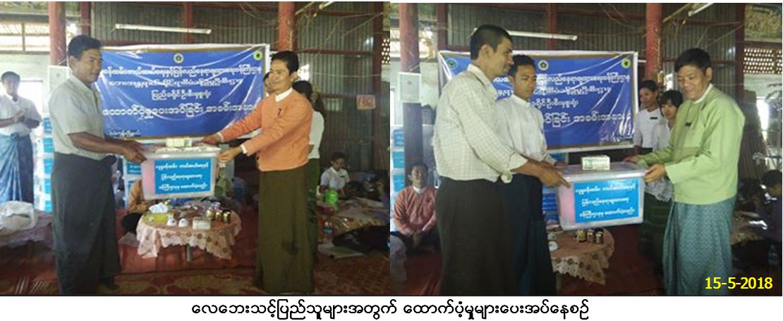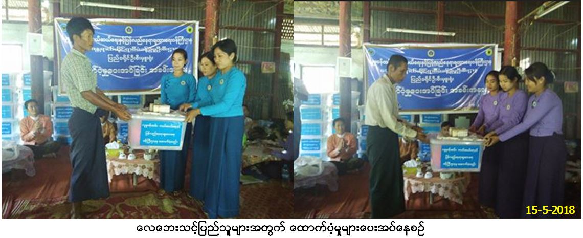 ဘေးအန္တရာယ်ဆိုင်ရာစီမံခန့်ခွဲမှုဦးစီးဌာန၊ ပြည်ခရိုင်ဦးစီးမှူးရုံးမှ တာဝန်ရှိသူများသည် ပဲခူးတိုင်းဒေသကြီး၊ ပြည်ခရိုင်၊ သဲကုန်းမြို့နယ်အတွင်း ရပ်ကွက်(၁)ခု၊ ကျေးရွာအုပ်စု(၁၂)စု၊ ကျေးရွာပေါင်း(၅၇)ရွာတို့တွင် (၇.၅.၂၀၁၈)နေ့ဖြစ်ပွားခဲ့သော လေဘေးသင့် ပြိုလဲအိမ်ခြေ(၃၄)လုံးအတွက် ထောက်ပံ့ရေးပစ္စည်း(၉)မျိုး၊ (၃၄)အိမ်ထောင်စာနှင့် အိမ်ဆောက်ပစ္စည်းဖိုး (၃၄၀၀၀၀၀ိ/-)၊ ပြိုလဲအိမ်လူဦးရေ (၁၂၁)ဦးအတွက် ဆန်ရိက္ခာဖိုး(၂၅၄၁၀၀ိ/-) ၊ တစိတ်တပိုင်းပျက်စီး/အမိုးလန်နေအိမ်(၁၇၁)လုံးနှင့် ဘုန်း ကြီးကျောင်း (၈)ကျောင်းတို့အတွက် တန်ဖိုးသင့်နှုန်းဖြင့် အိမ်ဆောက်ပစ္စည်းဖိုး(၁၂၉၂၈၄၀၀ိ/-)ကျပ်၊ စုစုပေါင်းရန်ပုံငွေကျပ် (၁၆၅၈၂၅၀၀ိ/-) တို့အား သဲကုန်းမြို့နယ်၊ ဆင်မြီးဆွဲမြို့လယ်ဓမ္မာရုံ၌ (၁၅-၅-၂၀၁၈)နေ့၊ (၁၅:၀၀)နာရီချိန်တွင် ပြည်သူလက်ဝယ်အရောက်သွားရောက်ထောက်ပံ့ခဲ့ရာ သဲကုန်းမြို့နယ်တိုင်း