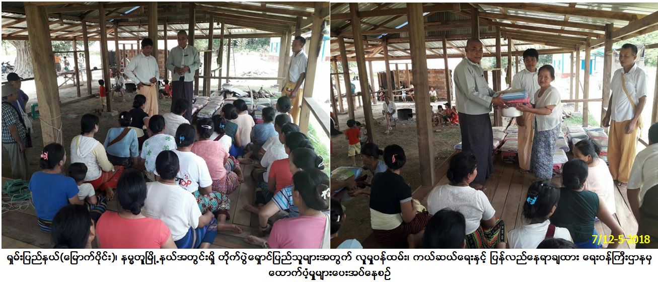 အဆိုပါ တိုက်ပွဲရှောင်ပြည်သူများအတွက် လူမှုဝန်ထမ်း၊ ကယ်ဆယ်ရေးနှင့် ပြန်လည်နေရာ ချထားရေးဝန်ကြီးဌာနအနေဖြင့် သက်ဆိုင် ရာ အထွေထွေအုပ်ချုပ်ရေးဦးစီးဌာနနှင့်ပူးပေါင်း၍ ထောက်ပံ့ကူညီမှုများဆောင်ရွက်လျက်ရှိရာ (၁၀-၅-၂၀၁၈)နေ့နှင့် (၁၁-၅-၂၀၁၈)နေ့တို့ တွင် ထပ်မံရောက်ရှိလာသည့် အိမ်ထောင်စု(၇၆)စု၊ လူဦးရေ(၂၃၀)ဦးတို့အတွက် ဆန်ရိက္ခာဖိုးငွေ (၄၈၃၀၀၀ိ/-)ကျပ်နှင့် ကယ်ဆယ်ရေးပစ္စည်း (၉)မျိုး (၇၆)အိမ်ထောင်စာ ထောက်ပံ့ပေးခဲ့ကြောင်းနှင့် (၇-၅-၂၀၁၈)နေ့မှ (၁၂-၅-၂၀၁၈)နေ့အထိ ပစ္စည်းနှင့်ငွေသားတန်ဖိုးငွေစုစုပေါင်း (၇၂၂၃၃၉ရိ/-) (ကျပ်ခုနစ်ဆယ့်နှစ်သိန်း နှစ်သောင်းသုံးထောင်သုံး ရာကိုးဆယ့်ခုနစ်တိတိ) ထောက်ပံ့ပြီးဖြစ်ကြောင်း၊ တိုက်ပွဲရှောင်ပြည်သူများ ထပ်မံရောက်ရှိလာပါက ထောက်ပံ့မှုများဆက်လက်ဆောင်ရွက်သွား