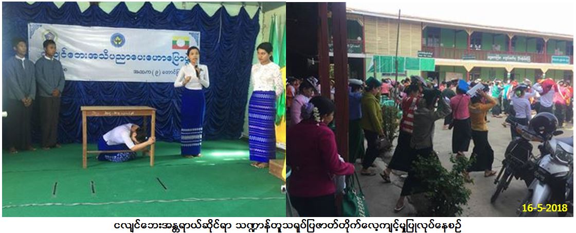 ဘေးအန္တရာယ်ဆိုင်ရာစီမံခန့်ခွဲမှုဦးစီးဌာန၊ ရှမ်းပြည်နယ်ဦးစီးမှူးရုံးမှ တာဝန်ရှိသူများသည် (၁၆-၅-၂၀၁၈)ရက်နေ့ နံနက်ပိုင်းတွင် အထက (၉) တောင်ကြီးမြို့၌လည်းကောင်း၊ နေ့လည်ပိုင်းတွင် အထက(၁)တောင်ကြီးမြို့၌လည်းကောင်း၊ ပညာရေးမွမ်းမံသင်တန်း တက်ရောက်နေသော အခြေခံပညာဦးစီးဌာနမှ ဆရာ/ဆရာမများအား ငလျင်ဘေးအသိပညာပေးဟောပြောခြင်းနှင့် လက်တွေ့ဇာတ်တိုက်လေ့ကျင့်ခြင်းများ ဆောင် ရွက်ခဲ့ရာ အထက(၉)တွင် ဆရာ/ ဆရာမ (၄၁၅) ဦး၊ အထက(၁)တွင် ဆရာ/ဆရာမ (၅၇၄)ဦး၊ စုစုပေါင်း (၉၈၉) ဦးတက်ရောက်ခဲ့ပါကြောင်း သတင်းရရှိပါသည်။