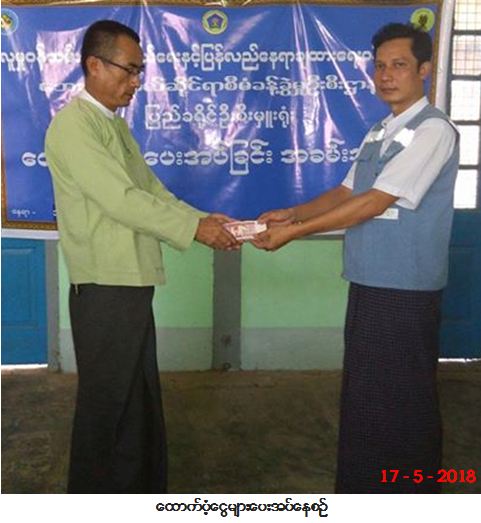 ဘေးအန္တရာယ်ဆိုင်ရာစီမံခန့်ခွဲမှုဦးစီးဌာန၊ပြည်ခရိုင်ဦးစီးမှူးရုံးမှ တာဝန်ရှိသူများသည် သာယာဝတီခရိုင်၊ အုတ်ဖိုမြို့နယ်၊ တယ်ပင်ကျောအုပ်စု၊ စွန်ကုန်းကျေးရွာ၌ (၁၄-၅-၂၀၁၈) ရက်နေ့တွင် လေပြင်း တိုက်ခတ်မှုကြောင့် ဘေးသင့်အမိုးလန်နေအိမ် (၄) လုံးအတွက် တန်ဖိုးသင့်နှုန်းထားများဖြင့် အိမ်ဆောက် ပစ္စည်းဖိုးငွေ (၁၂၀,၀၀၀ိ/-)ကျပ်တို့အား (၁၇-၅-၂၀၁၈) ရက်နေ့၊ (၁၃း၀၀) နာရီအချိန်တွင် ဘေးသင့် ပြည်သူများလက်ဝယ်အရောက်ထောက်ပံ့ပေးအပ်ခဲ့ကြောင်း သတင်းရရှိပါသည်။