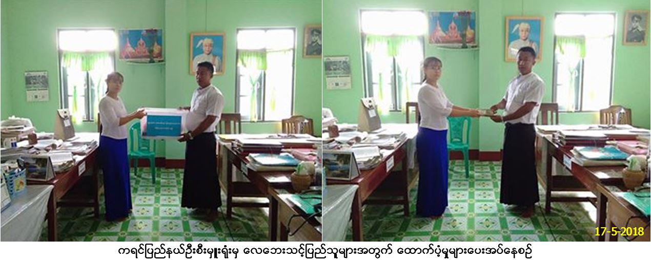 ဘေးအန္တရာယ်ဆိုင်ရာစီမံခန့်ခွဲမှုဦးစီးဌာန၊ ကရင်ပြည်နယ်ဦးစီးမှူးရုံးမှ တာဝန်ရှိသူများသည် (၄-၅-၂၀၁၈)ရက်နေ့ (၂၂း၀၀)အချိန်၌ သံတောင်ကြီးမြို့နယ်၊ စီပင်ကလေးကျေးရွာအုပ်စု၊ မိုင်(၂၀)ကျေးရွာတွင် လေပြင်းတိုက်ခတ်မှုဖြစ်ပွားခဲ့ရာ တစ်စိတ်တစ်ပိုင်းပျက်စီး အိမ်ခြေ (၁)လုံး၊ အိမ်ထောင်စု(၁)စု လူဦးရေ(၃)ဦးအတွက် ကယ်ဆယ်ရေးပစ္စည်း(၁၀)မျိုး (၁)အိမ်ထောင်စုစာနှင့် ပျက်စီးနေအိမ် (၁)လုံးအတွက် အိမ်ဆောက်ပစ္စည်းဖိုး ကျပ်(၇၀၀၀၀ိ/-)နှင့် ဆန်ရိက္ခာ(၇)ရက်စာ (၆၃၀၀ိ/-)ကျပ် စုစုပေါင်း(၇၆၃၀၀ိ/-)ကျပ်တို့အား သံတောင်ကြီးမြို့ နယ် အထွေထွေအုပ်ချုပ်ရေးဦးစီးဌာနသို့ (၁၇-၅-၂၀၁၈)ရက်နေ့တွင် လွှဲပြောင်းထောက်ပံ့ပေးခဲ့ကြောင်း သတင်းရရှိပါသည်။