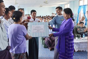 ထို့နောက် ဖျာပုံမြို့နယ်နှင့် ဒေးဒရဲမြို့နယ်အတွင်းရှိ ဘုန်းတော်ကြီးကျောင်းများအတွက် (၇) ပေသွပ်များနှင့် အလှူငွေများ၊ ရပ်ကွက်တွင်းနှင့် ကျေးရွာချင်း ဆက်ကွန်ကရစ်လမ်းများ၊ ဝန်ကြီးဌာနအသိအမှတ်ပြုကိုယ်အားကိုယ်ကိုးမူလတန်းကြိုကျောင်း (၈) ကျောင်းအတွက် ၂၀၁၅-၂၀၁၆ ဘဏ္ဍရေးနှစ် ထောက်ပံ့ငွေ (၆)သိန်းကျပ်စီနှင့် သင်ထောက်ကူပစ္စည်းများ၊ မသန်စွမ်းသူများအတွက် ဝှီးချဲများ၊ ရွာလုံးကျွတ်မီးလင်းရေး ကျေးရွာ (၄) ရွာအတွက် အင်ဂျင်မီးစက် (၁) လုံးစီ၊ ဖျာပုံမြို့နယ်၊ ကဇောင်းကျေးရွာမူကြိုကျောင်းဆောက်လုပ်ရန်အတွက် (၂၀၀) သိန်း၊ စုစုပေါင်းငွေသား (၃၇၅) သိန်းနှင့် (၃၁၈) သိန်းခန့်တန်ဖိုးရှိသော လူမှု စီးပွားဘဝမြင့်မားရေးအထောက်အကူပြုပစ္စည်းများကို သက်ဆိုင်သူများထံ ထောက်ပံ့ပေးသည်။ နေ့လယ်ပိုင်းတွင် သဲအိမ်ကျောင်းစုကျေးရွာသို့ ကွင်းဆင်း၍ ဝန်ကြီးဌာနမှလှူဒါန်းသော အင်ဂျင်မီးစက်ဖွင့်ပွဲအခမ်းအနားသို့ တက်ရောက်ပြီး ဖဲကြိုးဖြတ်ဖွင့်လှစ်ပေးခဲ့သည်။