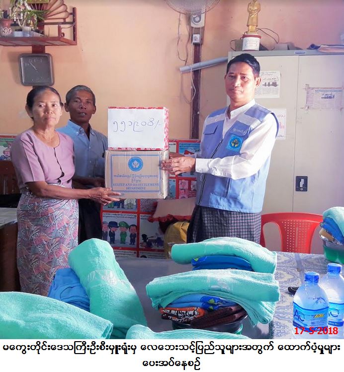 ဘေးအန္တရာယ်ဆိုင်ရာစီမံခန့်ခွဲမှုဦးစီးဌာန၊ မကွေးတိုင်းဒေသကြီးဦးစီးမှူးရုံးမှ တာဝန်ရှိသူများသည် နတ်မောက်မြို့နယ်၊ အောင်ချမ်းသာကျေးရွာတွင် (၁၁-၅-၂၀၁၈)ရက်နေ့၌ ဖြစ်ပွားခဲ့သော လေဘေးကြောင့် ဘေးသင့်ခဲ့သော အမိုးလန်နေအိမ် (၉)လုံးအတွက် အိမ်ဆောက် ပစ္စည်းဖိုးငွေ (၃၇၀,၀၀၀ိ/-)ကျပ်၊ ဘုန်းတော်ကြီးကျောင်း(၁)ကျောင်းအတွက် ကျောင်းဆောက်ပစ္စည်းဖိုး (၁၀၀,၀၀၀ိ/-)ကျပ်၊ လူဦးရေ (၃၉) ဦးအတွက် ဆန်ရိက္ခာ(၇)ရက်စာ (၈၁,၉၀၀ိ/-)ကျပ်၊ စုစုပေါင်း ထောက်ပံ့ငွေ (၅၅၁,၉၀၀ိ/-)ကျပ်နှင့် ကယ်ဆယ်ရေးပစ္စည်း (၉)မျိုး၊ အိမ်ထောင်စု (၉)စုစာတို့အား (၁၈-၅-၂၀၁၈)ရက်နေ့ (၁၀း၃၀)အချိန်တွင် ဘေးသင့်ပြည်သူများလက်ဝယ်အရောက် သွားရောက်ထောက်ပံ့ ပေးအပ်ခဲ့ကြောင်း သတင်းရရှိပါသည်။