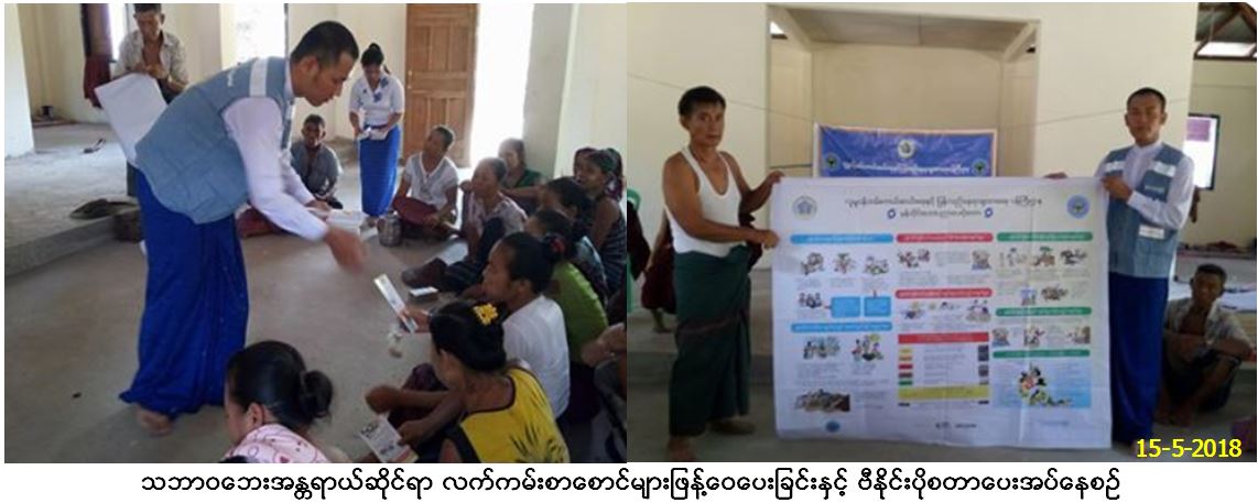 ဘေးအန္တရာယ်ဆိုင်ရာစီမံခန့်ခွဲမှုဦးစီးဌာန၊ ကရင်ပြည်နယ်ဦးစီးမှူးရုံးမှ တာဝန်ရှိသူများသည် (၁၅.၅.၂၀၁၈)ရက်နေ့တွင် လှိုင်းဘွဲမြို့နယ် ပိုင်ကျုံမြို့၊ ပေါလောက်ကျေးရွာအုပ်စု တောင်ကလေးကျေးရွာ၌ ကျေးရွာသူ/သား အင်အား(၁၀၀)ဦးအား သဘာဝဘေးအန္တရာယ်ဆိုင်ရာ အသိပညာပေးဟောပြောခဲ့ပြီး ကရင်ပြည်နယ်တွင်ဖြစ်လေ့ရှိသော ဘေးအန္တရာယ်များနှင့်ပတ်သက်၍ ဆောင်ရန်၊ ရှောင်ရန်အချက်များအား ဆွေနွေးခြင်း၊ လက်ကမ်းစာစောင်များဖြန့်ဝေပေးခြင်း၊ ဗီနိုင်းပိုစတာပေးအပ်ခြင်းများဆောင်ရွက်ခဲ့ကြောင်း သတင်းရရှိပါသည်။