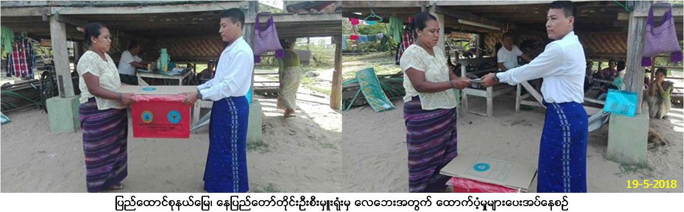 ဘေးအန္တရာယ်ဆိုင်ရာစီမံခန့်ခွဲမှုဦးစီးဌာန၊ ပြည်ထောင်စုနယ်မြေ၊ နေပြည်တော်တိုင်းဦးစီးမှူးရုံးမှ တာဝန်ရှိသူများသည် (၁၈.၅.၂၀၁၈)နေ့ (၁ရး၀၀)အချိန်တွင် မိုးသည်းထန်စွာရွာသွန်းပြီး လေပြင်းတိုက်ခတ်မှုကြောင့် ပုဗ္ဗသီရိမြို့နယ်၊ သပြေစမ်းကျေးရွာအုပ်စု သပြေစမ်းကျေးရွာ၌ လေဘေးဖြစ်ပွားခဲ့ပါသည်။ အဆိုပါ လေဘေး၌ အမိုးတစ်စိတ်တစ်ပိုင်းပျက်စီးခဲ့သော နေအိမ်(၁)လုံးအတွက် အိမ်ဆောက်ပစ္စည်းဖိုး (၂၅၀၀၀ိ/-)နှင့် ဘေးသင့်လူဦးရေ (၇)ဦးအတွက် ဆန်ရိက္ခာဖိုးငွေ (၇×၂၁၀၀ိ/-)နှုန်းဖြင့်(၁၄၇၀၀ိ/-) စုစုပေါင်းကယ်ဆယ်ရေး ရန်ပုံငွေ (၃၉၇၀၀ိ/-) ကယ်ဆယ်ရေးပစ္စည်း (၁၀)မျိုး(၁)အိမ်ထောင်စာအား (၁၉.၅.၂၀၁၈)နေ့(၁၅:၀၀)အချိန်တွင် ပြည်သူများလက်ဝယ်သို့ သွား ရောက်ထောက်ပံ့ပေးအပ်ခဲ့ကြောင်း သတင်းရရှိပါသည်။