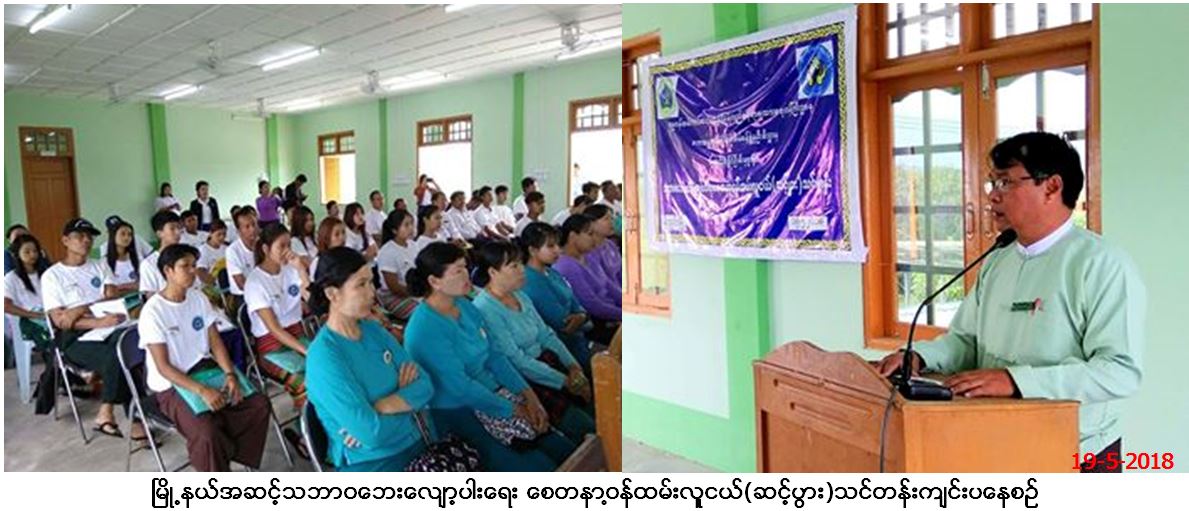 ဘေးအန္တရာယ်ဆိုင်ရာစီမံခန့်ခွဲမှုဦးစီးဌာန၊ ကချင်ပြည်နယ်ဦးစီးမှူးရုံးမှ တာဝန်ရှိသူများသည် (၁၉-၅-၂၀၁၈)ရက်နေ့၊ နံနက်(၉း၀၀)နာရီအချိန် တွင် မိုးညှင်းခရိုင်၊ မိုးညှင်းမြို့၌ မြို့နယ်အဆင့်သဘာဝဘေးလျော့ပါးရေးစေတနာ့ဝန်ထမ်းလူငယ် (ဆင့်ပွား)သင်တန်းအား ဖွင့်လှစ်ခဲ့ရာ အဆိုပါအခမ်းအနားသို့ မိုးညှင်းခရိုင်၊ မြို့နယ်အဆင့် အရာရှိ၊ အရာခံများနှင့် ဖိတ်ကြားထားသော ဧည့်သည်တော်များ၊ မိုးညှင်းမြို့ပေါ်ရပ်ကွက် အသီးသီးမှ ပရဟိတ လူငယ်မောင်မယ် စုစုပေါင်း(၃၀)ဦး တက်ရောက်ခဲ့ပြီး သင်တန်းကာလမှာ (၁၉-၅-၂၀၁၈)ရက်နေ့မှ (၂၁-၅-၂၀၁၈)ရက် ထိ (၃)ရက်တာကြာ မြင့်မည်ဖြစ်ကြောင်း သတင်းရရှိပါသည်။