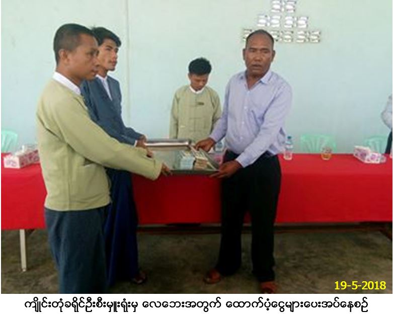 ဘေးအန္တရာယ်ဆိုင်ရာစီမံခန့်ခွဲမှုဦးစီးဌာန၊ ကျိုင်းတုံခရိုင်ဦးစီးမှူးရုံးမှ တာဝန်ရှိသူများသည် (၁၄.၅.၂၀၁၈)ရက်နေ့၊ မွန်းလွဲ (၂း၀၀)နာရီအချိန် တွင် မိုင်းဆတ်မြို့နယ်၌ လေပြင်းတိုက်ခတ်မှုကြောင့် အမိုးလန်ပျက်စီးသွားသော အိမ်ခြေ (၇၆)လုံးအတွက် အိမ်ဆောက်ပစ္စည်းဖိုး တစ်အိမ်လျှင် (၁)သိန်းနှုန်းဖြင့် (၇၆)သိန်းအား (၁၉.၅.၂၀၁၈)ရက်နေ့ နံနက် နံနက် (၁၀း၀၀)နာရီတွင် ဘေးသင့််ပြည်သူလက်ဝယ်အရောက် ကွင်းဆင်း ထောက်ပံ့ပေးအပ်ခဲ့ပါကြောင်း သတင်းရရှိပါသည်။
