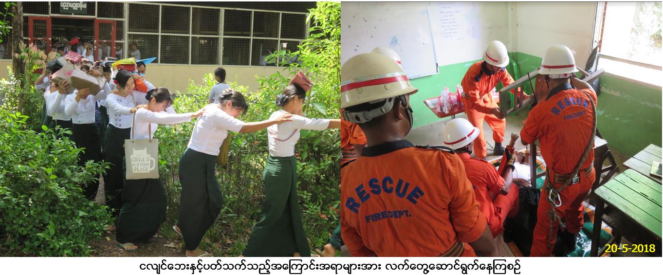 ဘေးအန္တရာယ်ဆိုင်ရာစီမံခန့်ခွဲမှုဦးစီးဌာန၊ ဧရာဝတီတိုင်းဒေသကြီးဦးစီးမှူးရုံးမှ တိုင်းဒေသကြီးဦးစီးမှူး ဦးသန်းစိုး (ညွှန်ကြားရေးမှူး)နှင့် တာဝန်ရှိသူများ၊ မီးသတ်ဦးစီးဌာနမှ တာဝန်ရှိသူများနှင့် ကြက်ခြေနီအသင်းတို့ပူးပေါင်း၍ (၂၀-၅-၂၀၁၈) ရက်နေ့၊ နံနက်(၀၈း၀၀)နာရီမှ (၁၀း၃၀)နာရီအထိ ပုသိမ်ခရိုင်၊ ပုသိမ်မြို့နယ်၊ အခြေခံပညာအထက်တန်းကျောင်း(ခွဲ) အလက(၁)၌ ဒုတိယတန်း သင်ရိုးသစ်မွမ်းမံသင်တန်း တွင် တက်ရောက်နေသော ဆရာ/ဆရာမ (၃၇၇)ဦီးအား ငလျင်ဘေးအန္တရာယ်ဆိုင်ရာ အသိပညာပေးဆွေးနွေးဟောပြောခြင်းနှင့် လက်တွေ့ လေ့ကျင့်ခြင်းများဆောင်ရွက်ခဲ့ကြောင်း သတင်းရရှိပါသည်။