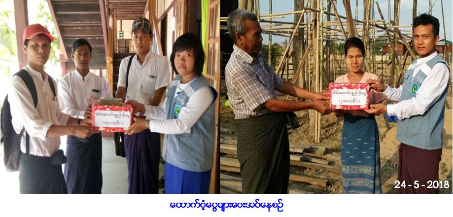 လူမှုဝန်ထမ်း၊ ကယ်ဆယ်ရေးနှင့် ပြန်လည်နေရာချထားရေးဝန်ကြီးဌာန၊ ဘေးအန္တရာယ်ဆိုင်ရာစီမံခန့်ခွဲမှု ဦးစီးဌာန၊ ပခုက္ကူခရိုင်ဦးစီးမှူးရုံးမှ တာဝန်ရှိသူများနှင့် ရေစကြိုမြို့နယ်ဦးစီးမှူးရုံးမှ တာဝန်ရှိသူများသည် ပခုက္ကူခရိုင်၊ ပခုက္ကူမြို့နယ်၊ ဒဲ့ပြားကျေးရွာအုပ်စု၊ ဒဲ့ပြားကျေးရွာ၌ (၂၂-၅-၂၀၁၈) ရက်နေ့တွင် မိုးသည်း ထန်စွာရွာသွန်းပြီး လေပြင်းတိုက်ခတ်မှုကြောင့် အမိုးလန် အိမ်ခြေ (၃) လုံး၊ အိမ်ထောင်စု (၃) စုအတွက် ကယ်ဆယ်ရေးပစ္စည်း (၉) မျိုး (၃) အိမ်ထောင်စာ၊ အိမ်ဆောက်ပစ္စည်းဖိုးငွေ (၁၅၀,၀၀၀ိ/-)ကျပ်နှင့် ဆန်ရိက္ခာဖိုးငွေ (၇) ရက်စာ (၁၈,၉၀၀ိ/-)ကျပ်၊ စုစုပေါင်း ထောက်ပံ့ငွေ (၁၆၈,၉၀၀ိ/-)ကျပ်တို့အား မြို့နယ် အထွေထွေအုပ်ချုပ်ရေးဦးစီးဌာနမှ တာဝန်ရှိသူများနှင့်အတူ ဘေးသင့်ပြည်သူများ လက်ဝယ် အရောက် ထောက်ပံ့ပေးခြင်းအားလည်းကောင်း၊ ရေစကြို မြို့နယ်၊ ဗလဘကျေးရွာအုပ်စု၊ ဗလဘ ကျေးရွာ၌ (၂၃-၅-၂၀၁၈) ရက်နေ့တွင်ဖြစ်ပွားခဲ့သော ကမ်းပြိုဘေးကြောင့် ပြောင်းရွှေ့အိမ်ခြေ (၂) လုံး၊ အိမ်ထောင်စု (၂) စုအတွက် ကယ်ဆယ်ရေးပစ္စည်း (၉) မျိုး (၂) အိမ်ထောင်စာ၊ အိမ်ဆောက်ပစ္စည်းဖိုးငွေ (၂၀၀,၀၀၀ိ/-) ကျပ်နှင့် လူဦးရေ (၈) ဦးအတွက် ဆန်ရိက္ခာဖိုးငွေ (၇) ရက်စာ (၁၆,၈၀၀ိ/-)ကျပ်၊ စုစုပေါင်း ထောက်ပံ့ငွေ (၂၁၆,၈၀၀ိ/-) ကျပ်တို့အား (၂၄-၅-၂၀၁၈) ရက်နေ့တွင် ကျေးရွာအုပ်ချုပ်ရေးမှူးနှင့်အတူ ဘေးသင့်ပြည်သူ များ လက်ဝယ်အရောက်ထောက်ပံ့ပေးအပ်ခဲ့ကြောင်း သတင်းရရှိပါသည်။