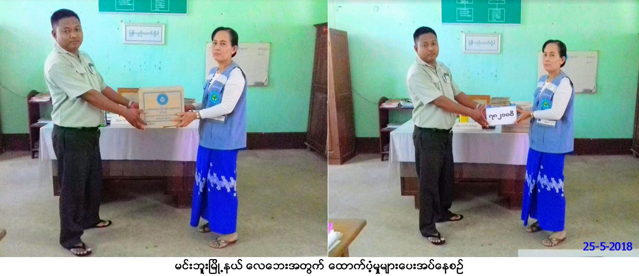 ကျောင်းဆောက်ပစ္စည်းဖိုး (၅၀,၀၀၀ိ/-)ကျပ်၊လူဦးရေ (၁၀၁)ဦးအတွက် ဆန်ရိက္ခာ(၇)ရက်စာ (၂၁၂,၁၀၀ိ/-)ကျပ်၊ စုစုပေါင်းထောက်ပံ့ငွေ (၇၈၂,၁၀၀ိ/-)ကျပ်နှင့် ကယ်ဆယ်ရေးပစ္စည်း (၉)မျိုး၊ အိမ်ထောင်စု (၂၆)စုစာတို့အား (၂၅-၅-၂၀၁၈)ရက်နေ့ (၁၁း၃၀)အချိန်တွင် ဘေးသင့် ပြည်သူများလက်ဝယ်အရောက် သွားရောက်ထောက်ပံ့ပေးအပ်ခဲ့ကြောင်း သတင်းရရှိပါသည်။