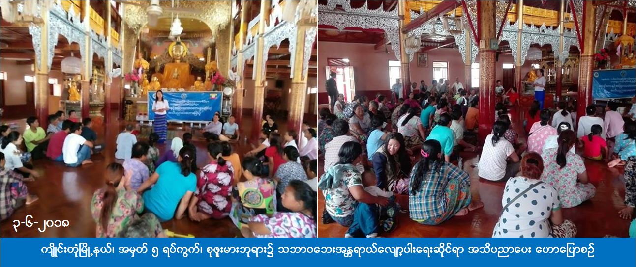 လူမှုဝန်ထမ်း၊ ကယ်ဆယ်ရေးနှင့် ပြန်လည်နေရာချထားရေးဝန်ကြီးဌာန၊ ဘေးအန္တရာယ်ဆိုင်ရာစီမံခန့်ခွဲမှုဦးစီးဌာန၊ ကျိုင်းတုံခရိုင်ဦးစီးမှူးရုံးမှ တာဝန်ရှိသူများသည် (၃-၆-၂၀၁၈) ရက်နေ့၊ ညနေ (၁၅း၀၀) နာရီမှ (၁၆း၃၀) နာရီအထိ ကျိုင်းတုံမြို့နယ်၊ အမှတ် ၅ ရပ်ကွက်၊ စုဖူးမားဘုရား၌ သဘာဝဘေးအန္တရာယ်လျော့ပါးရေးဆိုင်ရာ အသိပညာပေး ဟောပြောခြင်း၊ ငလျင်နှင့်ပတ်သက်၍ အသိပညာပေးခြင်း၊ ငလျင်လှုပ်ခတ်စဉ်အတွင်း ဆောင်လက်ရှောင်ရန်များ၊ နေထိုင်ရမည့်အနေအထားများအား လက်တွေ့သရုပ်ပြခြင်း၊ အသိပညာပေး လက်ကမ်းစာစောင်များ ဖြန့်ဝေပေးခြင်းများ ဆောင်ရွက်ခဲ့ပါသည်။