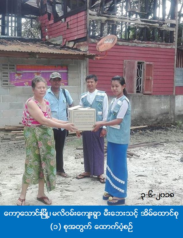 လူမှုဝန်ထမ်း၊ ကယ်ဆယ်ရေးနှင့် ပြန်လည်နေရာချထားရေးဝန်ကြီးဌာန၊ ဘေးအန္တရာယ်ဆိုင်ရာစီမံခန့်ခွဲမှုဦးစီးဌာန၊ ကော့သောင်းခရိုင်ဦးစီးမှူးရုံးမှ တာဝန်ရှိသူများသည် ကော့သောင်းမြို့၊ မလိဝမ်းကျေးရွာ၌ (၂-၆-၂၀၁၈) ရက်နေ့တွင် ဖြစ်ပွားခဲ့သော မီးဘေးကြောင်း ဘေးသင့်ခဲ့သည့် အိမ်ထောင်စု (၁) စုအတွက် ကယ်ဆယ်ရေးပစ္စည်း (၁၀) မျိုး (၁) အိမ်ထောင်စာကို (၃-၆-၂၀၁၈) ရက်နေ့တွင် ဘေးသင့်ပြည်သူများထံ သွားရောက်ထောက်ပံ့ပေးခဲ့ကြောင်း သိရှိရပါသည်။