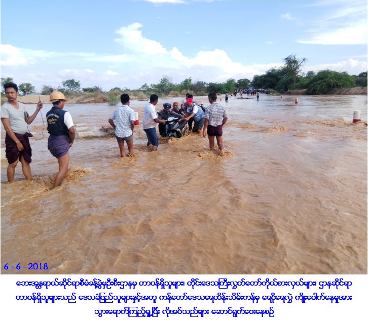 ပခုက္ကူခရိုင်၊ ပခုက္ကူမြို့နယ်တွင်မိုးဆက်တိုက်ရွာသွန်းမှုကြောင့် (၆-၆-၂၀၁၈) ရက်နေ့တွင် ကန်တော် ကျေးရွာ အုပ်စု၊ ကန်တော်ကျေးရွာ၊ ကန်တော်ဒေသ ထိန်းသိမ်း ကန်မှ ရေပိုရေလွှဲ ပေ(၃၀၀)ခန့် အနက်မှ ပေ(၁၀၀) ခန့်သည် နံနက် ၅နာရီခန့်က ကျိုးပဲ့ခဲ့သည်။ အဆိုပါ ရေပိုလွှဲမှရေကျော်မှုများကြောင့် ပခုက္ကူ-ကမ္မလမ်း မိုင်တိုင် အမှတ် ၁၁/၂ ကန်တော်အရှေ့ ရေကျော်တွင် ၁ပေခန့်ရေကျော်မှုဖြစ်ပွား ခြင်းကြောင့် ယာဉ်သွားမှု ခေတ္တရပ် ဆိုင်းခဲ့ရပါသည်၊၊ လူမှုဝန်ထမ်း၊ ကယ်ဆယ်ရေးနှင့် ပြန်လည်နေရာချထားရေးဝန်ကြီးဌာန၊ ဘေးအန္တရာယ် ဆိုင်ရာ စီမံခန့်ခွဲမှုဦးစီးဌာန၊ ပခုက္ကူခရိုင်ဦးစီးမှူးရုံးမှ တာဝန်ရှိသူများသည် တာဝန်ရှိသူများသည် ထိုရေဝင် တိုက်စား ကျိုးပဲ့သည့် ကန်တော်ဒေသရေထိန်းကန်သို့ တိုင်းဒေသကြီးလွှတ်တော်ကိုယ်စားလှယ် ဒေါ်ဇင်နီနီဝင်းနှင့်ဦးဟန်ဇော်ဝင်း ပခုက္ကူမြို့နယ်အုပ်ချုပ်ရေးမှူး ဦးမြင့်ဆောင်၊ ပခုက္ကူခရိုင် ဆည်မြောင်းနှင့် ရေအသုံးချမှု စီမံခန့်ခွဲရေး ဦးစီးဌာန (ဆည်မြောင်း)မှ ခရိုင်ဦးစီးမှူး ဦးဇော်ဦးနှင့် ဝန်ထမ်းများ၊ မီးသတ်ဝန်ထမ်းများ၊ ဌာနဆိုင်ရာ များနှင့်အတူ သွားရောက်စစ်ဆေးကြည့်ရှုကြပြီး ရေပိုလွှဲနှင့်ကန်ပေါင်များ ထပ်မံမပျက်စီးစေရန်နှင့် လမ်းပန်း ဆက်သွယ်မှု အခက်အခဲမဖြစ်စေရန်တို့အတွက် လူမှုကူညီရေးအသင်းအဖွဲ့များ၊ ဒေသခံပြည်သူများနှင့်အတူ ပူးပေါင်း၍ စက်အား၊ လူအားများဖြင့် ဝိုင်းဝန်းဆောင်ရွက်လျက်ရှိပါသည်။ထိုကန်တော်ဒေသရေထိန်းကန်သည် ရေကျော်များမှုကြောင့် တာဝန်ရှိသူများမှ ဆက်လက်ထိန်းချုပ်မရဘဲ ကျိုးပဲ့သွားကြောင်း နောက်ဆုံး သတင်း အရသိရသည်။ လွန်ခဲ့သောနှစ်ပေါင်း(၇၀၀)ခန့်က အနော်ရထာမင်းတည်ဆောက်ခဲ့သော ကန်တစ်ကန်ဖြစ်ပြီး ကျေးရွာဒေသခံများမှ ထိန်းသိမ်းစောင့်ရှောက်ထားခြင်းဖြစ်ပြီး၊ ယင်းကန်သည် ရေဆင်းဧရိယာ ကျယ်ပြန့်ခြင်း ကြောင့် ရေဝင်များသည့်ကန်တစ်ခုဖြစ်ကြောင်းသိရသည်။