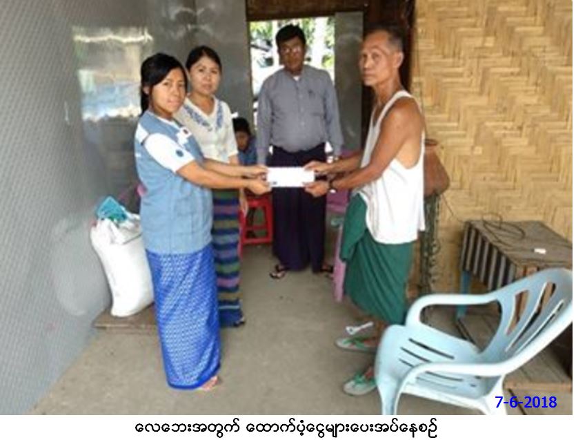 လူမှုဝန်ထမ်း၊ ကယ်ဆယ်ရေးနှင့် ပြန်လည်နေရာချထားရေးဝန်ကြီးဌာန၊ ဘေးအန္တရာယ်ဆိုင်ရာစီမံခန့်ခွဲမှုဦးစီးဌာန၊ ကချင်ပြည်နယ်ဦးစီးမှူးရုံးမှ တာဝန်ရှိသူများသည် (၃၀-၅-၂၀၁၈)ရက်နေ့ (၁၀း၄၀)နာရီအချိန်၌ ကချင်ပြည်နယ်၊ မြစ်ကြီးနားမြို့နယ်၊ အောင်နန်းရပ်ကွက်တွင် မိုးသည်း ထန်စွာရွာသွန်းပြီး လေပြင်းထန်စွာတိုက်ခတ်မှုကြောင့် ညောင်ပင်ပြိုလဲ၍ ပိမိကာ ဒဏ်ရာရရှိသည့် လူနာ(၃)ဦးအတွက် တစ်ဦးလျှင် (၅၀၀၀၀ိ/-)ကျပ်စီ စုစုပေါင်း (၁၅၀၀၀၀/-)ကျပ်တို့အား (၇-၆-၂၀၁၈)နေ့ (၁၄း၀၀)နာရီအချိန်တွင် သွားရောက်ထောက်ပံ့ပေးအပ်ခဲ့ကြောင်း သတင်းရရှိပါသည်။