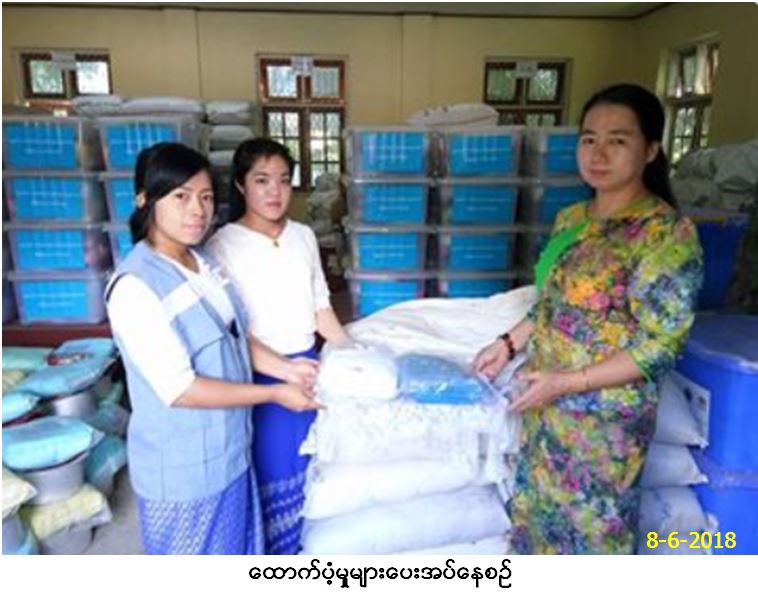 လူမှုဝန်ထမ်း၊ ကယ်ဆယ်ရေးနှင့် ပြန်လည်နေရာချထားရေးဝန်ကြီးဌာန၊ ဘေးအန္တရာယ်ဆိုင်ရာစီမံခန့်ခွဲမှုဦးစီးဌာန၊ ကချင်ပြည်နယ်ဦးစီးမှူးရုံးမှ တာဝန်ရှိသူများသည် မြစ်ကြီးနားခရိုင်၊ ချီဖွေမြို့နယ်ရှိ ဆင်းရဲနွမ်းပါးသောပြည်သူများအတွက် ရှပ်တိုရောင်စုံ (၂၅၀)၊ စတစ်လက်ရှည်(၃၀၀)၊ CVC ပန်းရိုက်ရှပ်တိုု(၂၅၀)နှင့် တီရှပ်(၈၀၀)ထည်တို့အား ပြည်သူ့လွှတ်တော်ကိုယ်စားလှယ်ဦးဇုံးတိန့်(ကိုယ်စား) ကိုယ်စားလှယ်တစ်ဦး ထံသို့ (၈-၆-၂၀၁၈)ရက်နေ့(၁၀း၄၅)အချိန်တွင် ထောက်ပံ့ပေးအပ်ခဲ့ကြောင်း သတင်းရရှိပါသည်။