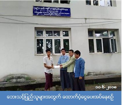 (၂.၆.၂၀၁၈) ရက်နေ့တွင် လှိုင်မြို့နယ်၊ အမှတ်(၁၁)ရပ်ကွက်၊ ပြည်လမ်းရှိ ယခင် စားသောက်ဆိုင်ဖြစ်သော Hong Bao Sun House ဆိုင်အား ပြင်ဆင်နေစဉ် Gas ပိုက်မှ ယိုစိမ့်နေသည်ကို မသိရှိပဲ မိုဘိုင်းတယ်လီဖုန်းအား ပလပ်ခုံတွင်အားသွင်းစဉ် ပလပ်ခုံမှ မီးပွားSpark ရရှိပြီး ထိတွေ့ပေါက်ကွဲမှုဖြစ်ပွားခဲ့ရာ အလုပ်လုပ်ကိုင်လျက် ရှိသော အလုပ်သမား(၈)ဦးတွင် (၂)ဦးသေဆုံးခဲ့ပြီး (၆)ဦးမှာ ရန်ကုန်ပြည်သူ့ဆေးရုံကြီးရှိ မျက်နှာ၊ မေးရိုးနှင့် ခံတွင်း ပြုပြင်မှုဆိုင်ရာ ခွဲစိတ်ကုသရေးဌာနတွင် ဆေးကုသမှု ခံယူလျက်ရှိရာ အဆိုပါ ဒဏ်ရာရလူနာများနှင့် သေဆုံးသူအတွက် နစ်နာကြေးအား ဆွေမျိုးများသို့ (၈.၆.၂၀၁၈ ) ရက်နေ့တွင် ရန်ကုန်တိုင်းဒေသကြီး ဘေးအန္တရာယ်ဆိုင်ရာ စီမံခန့်ခွဲမှုဦးစီးဌာနမှ တာဝန်ရှိသူများသည် ရန်ကုန်တိုင်းဒေသကြီးလွှတ်တော် ဥက္ကဌ ဦးတင်မောင်ထွန်း၊ ရန်ကုန်တိုင်းဒေသကြီး အစိုးရအဖွဲ့မှ လူမှုရေးဝန်ကြီး၊ ဦးနိုင်ငံလင်း၊ လှိုင်မြို့နယ်အထွေထွေ အုပ်ချုပ်ရေးဦးစီးဌာနနှင့်ဆေးရုံမှ တာဝန်ကျ ဆရာဝန်များ၊ သူနာပြုများနှင့်အတူ သေဆုံးသူ(၂)ဦးအတွက် (၁) ဦးလျှင် (၃၀၀,၀၀၀) ကျပ်နှုန်းနှင့် ထောက်ပံ့ငွေ(၆၀၀,၀၀၀) ကျပ်၊ ဒဏ်ရာရ(၆)ဦးအတွက် (၁) ဦးလျှင် (၅၀,၀၀၀)ကျပ်နှုန်းနှင့် ထောက်ပံ့ငွေ(၃၀၀,၀၀၀)ကျပ်၊ စုစုပေါင်း ထောက်ပံ့ငွေ(၉၀၀,၀၀၀) အား ထောက်ပံ့ ပေးအပ်ခဲ့ကြောင်း သိရှိရပါသည်။