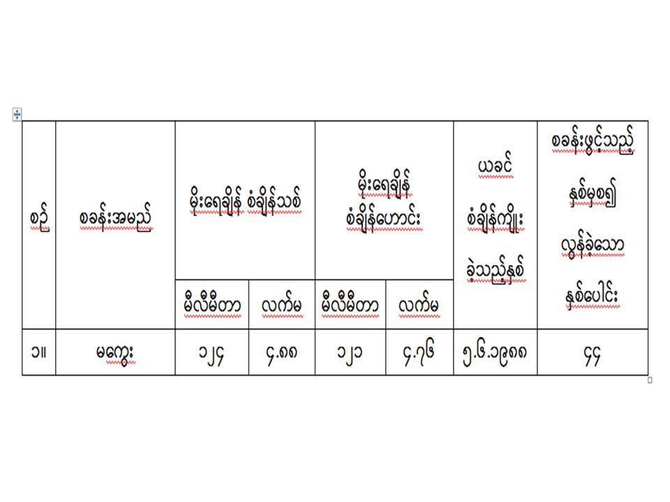 ၂၀၁၈ ခုနှစ်၊ ဇွန်လ (၁၁)ရက်နေ့ မြန်မာစံတော်ချိန် (၀၉:၃၀)နာရီအချိန် တိုင်းထွာချက်များအရ အောက်ဖော်ပြပါစခန်း၌ ဇွန်လ၏ (၂၄)နာရီအတွင်း ရွာသွန်းခဲ့သော မိုးရေချိန်စံချိန်သစ်