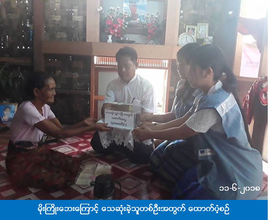လူမှုဝန်ထမ်း၊ ကယ်ဆယ်ရေးနှင့် ပြန်လည်နေရာချထားရေးဝန်ကြီးဌာန၊ ဘေးအန္တရာယ်ဆိုင်ရာစီမံခန့်ခွဲမှုဦးစီးဌာန၊ ပဲခူတိုင်းဒေသကြီးဦးစီးမှူးရုံးမှ တာဝန်ရှိသူများသည် ပဲခူးမြို့နယ်၊ ဥဿာမြို့သစ် အမှတ် (၇) ရပ်ကွက်၊ မြေတိုင်း ၁၊ ဝိမလလမ်း၌ (၉-၆-၂၀၁၈) ရက်နေ့တွင် ဖြစ်ပွားခဲ့သော မိုးကြိုးဘေးကြောင့် သေဆုံးသူ တစ်ဦးအတွက် ထောက်ပံ့ငွေ (၃၀၀၀၀၀) ကျပ်အား (၁၁-၆-၂၀၁၈) ရက်နေ့တွင်သွားရောက်ထောက်ပံ့ခဲ့ကြောင်း သိရှိရပါသည်။