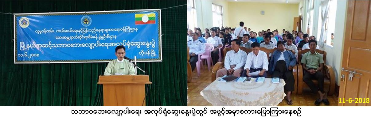 လူမှုဝန်ထမ်း၊ ကယ်ဆယ်ရေးနှင့် ပြန်လည်နေရာချထားရေးဝန်ကြီးဌာန၊ ဘေးအန္တရာယ်ဆိုင်ရာစီမံခန့်ခွဲမှုဦးစီးဌာန၊ ရှမ်းပြည်နယ်ဦးစီးမှူးရုံးမှ တာဝန်ရှိသူများသည် (၁၁-၆-၂၀၁၈)ရက်နေ့တွင် “ဝ” ကိုယ်ပိုင်အုပ်ချုပ်ခွင့်ရတိုင်း၊ ဟိုပန်ခရိုင်၊ ဟိုပန်မြို့၌ မြို့နယ်အဆင့်သဘာဝဘေး လျော့ပါးရေးအလုပ်ရုံဆွေးနွေးပွဲကျင်းပပြုလုပ်ခဲ့ရာ တိုင်းဦးစီးအဖွဲ့အတွင်းရေးမှူးမှ အဖွင့်အမှာစကားပြောကြားခြင်း၊ ရှမ်းပြည်နယ်ဦးစီးမှူး (ဘေးစီမံ)မှ ရှမ်းပြည်နယ်အတွင်း ဖြစ်ပွားနိုင်သော သဘာဝဘေးများအတွက် ကြိုတင်ပြင်ဆင်ဆောင်ရွက်ရန် လိုအပ်သည့်လုပ်ငန်းစဉ်များ မိမိ ဝန်ကြီးဌာန၏ သဘာဝဘေးလျော့ပါးရေးလုပ်ငန်းဆောင်ရွက်နေမှုနှင့် ထောက်ပံ့မှုလုပ်ငန်းစဉ်များ မြို့နယ်သဘာဝဘေးစီမံခန့်ခွဲမှုအဖွဲ့များ နှင့်ပြည်သူူလုထုမှ ကြိုတင်ပြင်ဆင်ဆောင်ရွက်သင့်သည့်လုပ်ငန်းစဉ်များကို ဦးဆောင်ဆွေးနွေးခြင်းနှင့် အပြန်အလှန်ဆွေးနွေးခြင်းများ ဆောင်ရွက်ခဲ့ရာ တိုင်းဦးစီးအဖွဲ့အတွင်းရေးမှူးနှင့် အလုပ်အမှုဆောင်အဖွဲ့ဝင်များ မြို့မိမြို့ဖများ ခရိုင်/မြို့နယ်အဆင့်ဌာနဆိုင်ရာများ လူမှုရေး အသင်းအဖွဲ့များမှ တာဝန်ရှိသူများ စုစုပေါင်းအင်အား (၈၀)ဦးခန့်တက်ရောက်ခဲ့ပြီး တက်ရောက်လာသူများအား ဘေးနှင့်ပတ်သက်သည့် လက်ကမ်းစာစောင်များဖြန့်ဝေပေးခဲ့ကြောင်း သတင်းရရှိပါသည်။