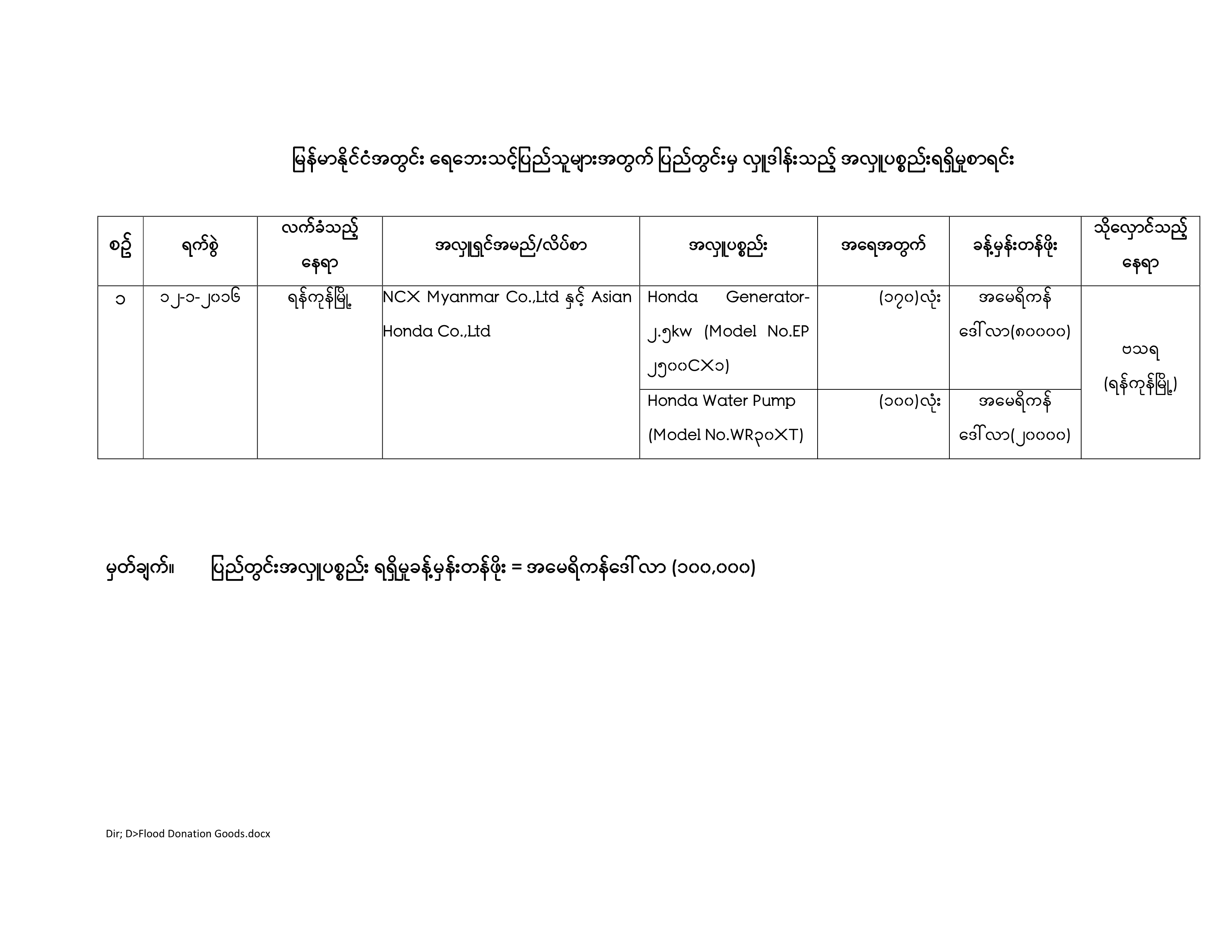 မြန်မာနိုင်ငံအတွင်း ရေဘေးသင့်ပြည်သူများအတွက် (၁၂-၁-၂၀၁၆) ရက်နေ့တွင် ပြည်တွင်းမှ လှူဒါန်းသည့် အလှူပစ္စည်းလက်ခံရရှိမှုစာရင်းအား အောက်ပါဇယားတွင် လေ့လာနိုင်သည်