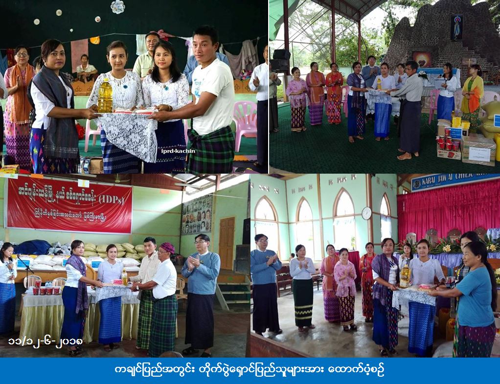 လူမှုဝန်ထမ်း၊ ကယ်ဆယ်ရေးနှင့် ပြန်လည်နေရာချထားရေးဝန်ကြီးဌာန၊ ဘေးအန္တရာယ်ဆိုင်ရာစီမံခန့်ခွဲမှုဦးစီးဌာန၊ ကချင်ပြည်နယ်ဦးစီးမှူးရုံးမှ တာဝန်ရှိသူများသည် ကချင်ပြည်နယ်၊ ဝိုင်းမော်မြို့နယ်၊ ဇုံနယ်နှစ်ခြင်းဘုရားကျောင်း၊ မြစ်ကြီးနားမြို့နယ်၊ တန်ဖဲဘုရားကျောင်း၊ ဂျော်မဆတ်ဘုရားကျောင်းနှင့် တြီနီတီဘုရားကျောင်းသို့ ရှောက်ရှိလာသော ခေတ္တနေရပ်စွန့်ခွာပြည်သူ အိမ်ထောင်စု (၇၂၁) စု လူဦးရေ (၃၂၀၆) ဦးတို့အတွက် အမျိုးသား သဘာ၀ဘေးအန္တရယ်ဆိုင်ရာစီမံခန့်ခွဲမှုရန်ပုံငွေဖြင့် ဆန် (၁၀၀၁ ) အိတ် ၂၁ ပြည်၊ ဆီ (၁၄၄၂) ပိဿာ၊ ဆား (၇၂၁) ပိဿာ၊ ပဲ (၁၄၄၂) ပိဿာ၊ (၃၉၇၈၉၇၅၀ိ/-) တန်ဖိုးရှိ ဆန် ဆီ ဆား ပဲ (၁) လစာ၊ ရေသန့်ဆေး (၅၇၆၀) ထုပ်နှင့် တစ်ကိုယ်ရည်သန်ရှင်းရေးသုံးပစ္စည်းများ (၃၃) အိတ်တို့အား (၁၁-၆-၂၀၁၇) ရက်နေ့နှင့် (၁၂-၆-၂၀၁၈) ရက်နေ့တို့တွင် ကချင်ပြည်နယ်ဝန်ကြီးချုပ်၏ဇနီး ဒေါက်တာဂျေကော့ဘူ၏ခရီးစဉ်တွင် ထောက်ပံ့ပေးအပ်ခဲ့ကြောင်း သိရှိရပါသည်။
