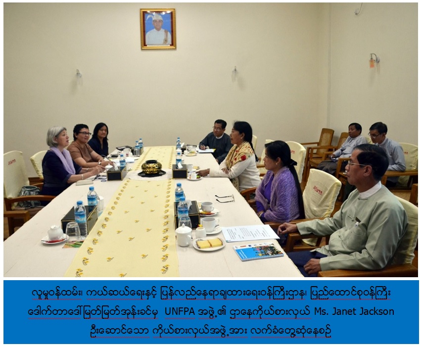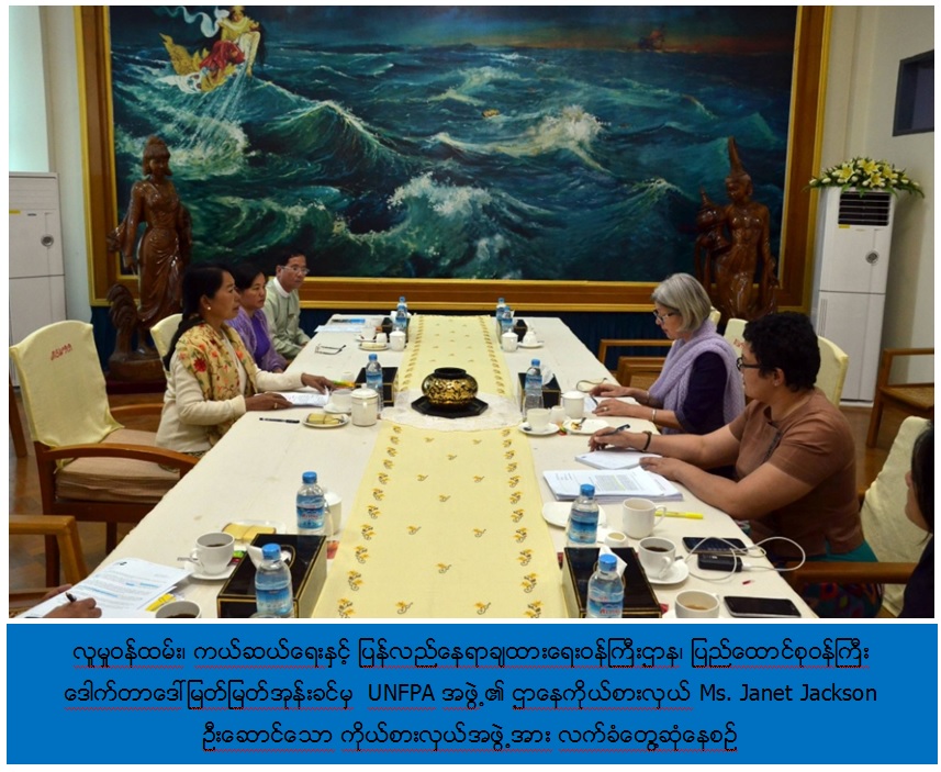လူမှုဝန်ထမ်း၊ ကယ်ဆယ်ရေးနှင့်ပြန်လည်နေရာချထားရေးဝန်ကြီးဌာန၊ ပြည်ထောင်စုဝန်ကြီး ဒေါက်တာမြတ်မြတ်အုန်းခင်အား UNFPA အဖွဲ့မှ ဌာနေကိုယ်စားလှယ် Ms. Janet Jackson ဦးဆောင်သော ကိုယ်စားလှယ်အဖွဲ့သည် (၁၂-၁-၂၀၁၆) ရက်နေ့၊ မွန်းလွဲ (၂) နာရီအချိန်တွင် နေပြည်တော်ရှိ ပြည်ထောင်စုဝန်ကြီးရုံး၊ မေခလာခန်းမ၌ လာရောက်တွေ့ဆုံသည်။