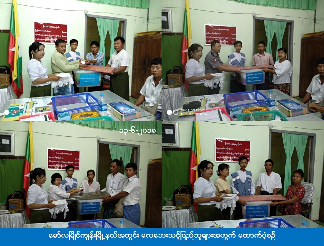 လူမှုဝန်ထမ်း၊ ကယ်ဆယ်ရေးနှင့် ပြန်လည်နေရာချထားရေးဝန်ကြီးဌာန၊ ဘေးအန္တရာယ်ဆိုင်ရာစီမံခန့်ခွဲမှုဦးစီးဌာန၊ လပွတ္တာခရိုင်ဦးစီးမှူးရုံးမှ တာဝန်ရှိသူများသည် မော်လမြိုင်ကျွန်းမြို့နယ်၊ ဘုရားချောင်းတံခွန်တိုင်ကျေးရွာအုပ်စု၊ ဘုရားချောင်းကျးရွာ၌ (၉-၆-၂၀၁၈) ရက်နေ့တွင် ဖြစ်ပွားခဲ့သော လေဘေးကြောင့် ပြိုကျခဲ့သည့် နေအိမ်(၁)လုံး၊ အိမ်ထောင်စု (၁) စုမှ လူဦးရေ (၃) ဦးအတွက် ကယ်ဆယ်ရေးပစ္စည်း(၁၆) မျိုးပါ (၁)အိမ်ထောင်စာ၊ အိမ်ဆောက်ပစ္စည်းဘိုးနှင့် ဆန်ရိက္ခာဘိုး (၁၀၆၃၀၀ိ/-) အားလည်းကောင်း၊ လပွတ်ကွဲနုံးတန်းကျေးရွာအုပ်စု၊ ကညင်ချောင်းကျေးရွာ၌ (၁၀-၆-၂၀၁၈) ရက်နေ့တွင် ဖြစ်ပွားခဲ့သော လေဘေးကြောင့် ပြိုကျခဲ့သည့် နေအိမ်(၁)လုံး၊ အိမ်ထောင်စု(၁)စုမှ လူဦးရေ(၃)ဦးအတွက် ကယ်ဆယ်ရေးပစ္စည်း(၁၆) မျိုးပါ(၁)အိမ်ထောင်စာ၊ အိမ်ဆောက်ပစ္စည်းဘိုးနှင့် ဆန်ရိက္ခာဘိုး(၁၀၆၃၀၀ိ/-) အားလည်းကောင်း၊ ဘုရားကြီးကုန်းကျေးရွာအုပ်စု၊ မြဂိုးစုကျေးရွာ၌ (၁၀-၆-၂၀၁၈) ရက်နေ့တွင် ဖြစ်ပွားခဲ့သော လေဘေးကြောင့် ပြိုကျခဲ့သည့်နေအိမ်(၁)လုံး၊ အိမ်ထောင်စု(၁)စုမှ လူဦးရေ(၃)ဦးအတွက် ကယ်ဆယ်ရေးပစ္စည်း(၁၆)မျိုးပါ(၁)အိမ်ထောင်စာ၊ အိမ်ဆောက်ပစ္စည်းဘိုးနှင့် ဆန်ရိက္ခာဘိုး(၁၀၆၃၀၀ိ/-)အားလည်းကောင်း၊ ကျော်ဇံကျေးရွာအုပ်စု၊ ခလောက်ပုံကျေးရွာ၌ (၁၀-၆-၂၀၁၈) ရက်နေ့တွင် ဖြစ်ပွားခဲ့သော လေဘေးကြောင့် ပြိုကျခဲ့သည့်နေအိမ်(၁)လုံး၊ အိမ်ထောင်စု(၁)စုမှ လူဦးရေ(၃)ဦးအတွက် ကယ်ဆယ်ရေးပစ္စည်း(၁၆)မျိုးပါ(၁)အိမ်ထောင်စာ၊ အိမ်ဆောက်ပစ္စည်းဘိုးနှင့် ဆန်ရိက္ခာဘိုး(၁၀၆၃၀၀ိ/-) အားလည်းကောင်း မော်လမြိုင်ကျွန်းမြို့နယ်အထွေထွေအုပ်ချုပ်ရေးဦးစီးဌာန၌ (၁၃-၆-၂၀၁၈) ရက်နေ့၊ (၁၀း၀၀) နာရီအချိန်တွင် မြို့နယ်အုပ်ချုပ်ရေးမှူး၊ မြို့နယ်ရဲတပ်ဖွဲ့၊ ဌာနဆိုင်ရာများ၊ ကျေးရွာအုပ်ချုပ်ရေးမှူးများနှင့်အတူ ဘေးသင့်ပြည်သူများထံ ထောက်ပံ့ပေးအပ်ခဲ့ကြောင်း သိရှိရပါသည်။