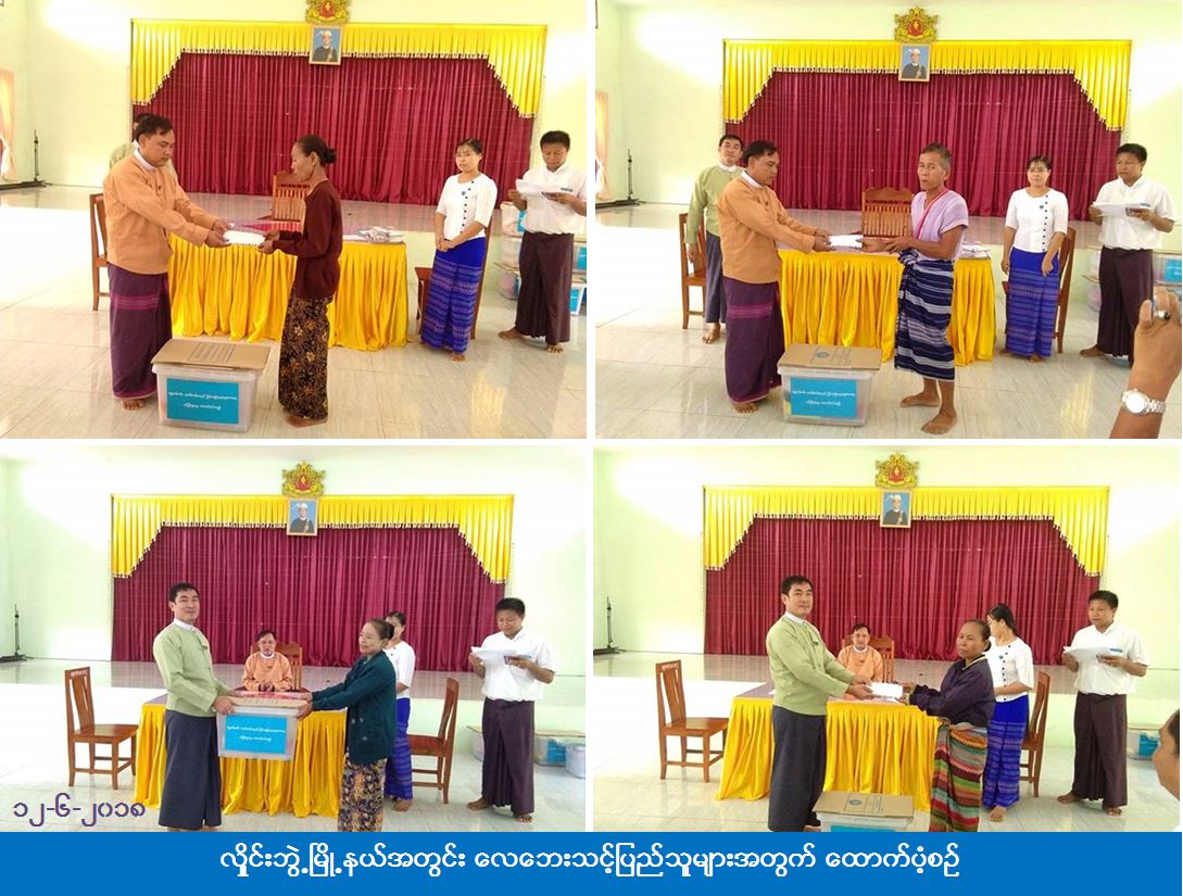 လူမှုဝန်ထမ်း၊ ကယ်ဆယ်ရေးနှင့် ပြန်လည်နေရာချထားရေးဝန်ကြီးဌာန၊ ဘေးအန္တရာယ်ဆိုင်ရာစီမံခန့်ခွဲမှုဦးစီးဌာန၊ ကရင်ပြည်နယ်ဦးစီးမှူးရုံးမှ တာဝန်ရှိသူများသည် လှိုင်းဘွဲမြို့နယ်၊ သာယာကုန်းကျေးရွာအုပ်စု၊ ပိန္နဲတောကျေးရွာအုပ်စု၊ တခွက်ဖိုးကျေးရွာအုပ်စုနှင့် ပိုင်ကျုံမြို့ ကော့နွဲ့ကျေးရွာအုပ်စုတို့၌ (၉-၆-၂၀၁၈)ရက်နေ့နှင့် (၁၀-၆-၂၀၁၈) ရက်နေ့တို့တွင် မိုးသည်းထန်စွာရွာသွန်းပြီး လေပြင်းတိုက်ခတ်မှုကြောင့် ပြိုကျပျက်စီးခဲ့သည့် နေအိမ် (၁) လုံးနှင့် တစ်စိတ်တစ်ပိုင်း ပျက်စီးခဲ့သည့် နေအိမ် (၈) လုံးတို့မှ အိမ်ထောင်စု(၉)စု လူဦးရေ(၂၆) ဦးအတွက် ကယ်ဆယ်ရေးပစ္စည်း (၁၆) မျိုး အိမ်ထောင်စု (၁) စုစာ၊ ကယ်ဆယ်ရေးပစ္စည်း (၁၁) မျိုး အိမ်ထောင်စု (၈) စုစာနှင့် ပြိုကျ/ပျက်စီးနေအိမ် (၉) လုံးအတွက် အိမ်ဆောက်ပစ္စည်းဖိုးငွေ (၇၇၇၅၀၀ိ/-) တို့အား (၁၂-၆-၂၀၁၈) ရက်နေ့တွင် လှိုင်းဘွဲမြို့နယ်အထွေထွေအုပ်ချုပ်ရေးဦးစီးဌာနအစည်းအဝေးခန်းမ၌ လှိုင်းဘွဲမြို့နယ်မှ အမျိုးသားလွှတ်တော်ကိုယ်စားလှယ် ဦးစောချစ်ဦး၊ လှိုင်းဘွဲမြို့နယ်အထွေထွေအုပ်ချုပ်ရေးဦးစီးဌာနမှ မြို့နယ်အုပ်ချုပ်ရေးမှူး ဦးမင်းသိန်းတို့နှင့်အတူ ထောက်ပံ့ပေးအပ်ခဲ့ကြောင်း သိရှိရပါသည်။