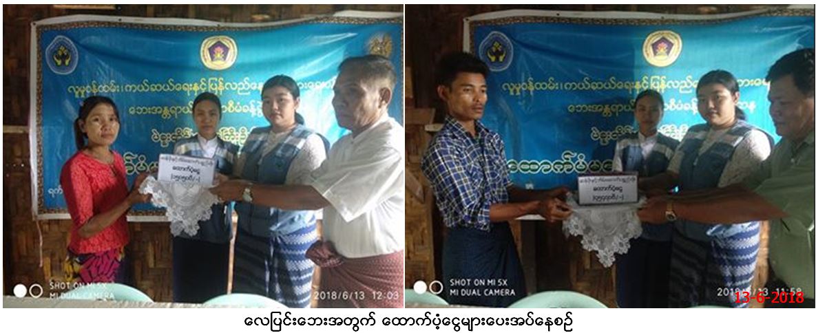 လူမှုဝန်ထမ်း၊ ကယ်ဆယ်ရေးနှင့် ပြန်လည်နေရာချထားရေးဝန်ကြီးဌာန၊ ဘေးအန္တရာယ်ဆိုင်ရာစီမံခန့်ခွဲမှုဦးစီးဌာန၊ ပဲခူးတိုင်းဒေသကြီးဦးစီးမှူး ရုံးမှ တာဝန်ရှိသူများ သည် ပဲခူးတိုင်းဒေသကြီး၊ သနပ်ပင်မြို့နယ်၊ မြို့ပေါ်ရပ်ကွက် (၁) ခု၊ ကျေးရွာအုပ်စု(၃)ခုမှ ကျေးရွာ(၄)ရွာတွင် (၉/၁၁. ၆.၂၀၁၈)ရက်နေ့၌ ဖြစ်ပွားခဲ့သော လေပြင်းတိုက်ခတ်မှုကြောင့် အမိုးလန်နေအိမ်(၁၈)လုံးအတွက် အိမ်ဆောက်ပစ္စည်းဖိုးထောက်ပံ့ငွေ (၃၉၀,၀၀၀/-)ကျပ်၊ ပြိုလဲနေအိမ်(၄)လုံးအတွက် အိမ်ဆောက်ပစ္စည်းဖိုးထောက်ပံ့ငွေ(၄၀၀,၀၀၀/-)ကျပ်၊ လူဦးရေ (၁၃)ဦးအတွက်(၂၇,၃၀၀/-)ကျပ်၊ စုစုပေါင်းထောက်ပံ့ငွေ (၈၁၇,၃၀၀/-)ကျပ်နှင့် ကယ်ဆယ်ရေးပစ္စည်း(၁၆)မျိုး(၄)အိမ်ထောင်စာတို့အား (၁၃.၆.၂၀၁၈)ရက်နေ့တွင် သွားရောက်ထောက်ပံ့ပေးအပ်ခဲ့ကြောင်း သတင်းရရှိပါသည်။