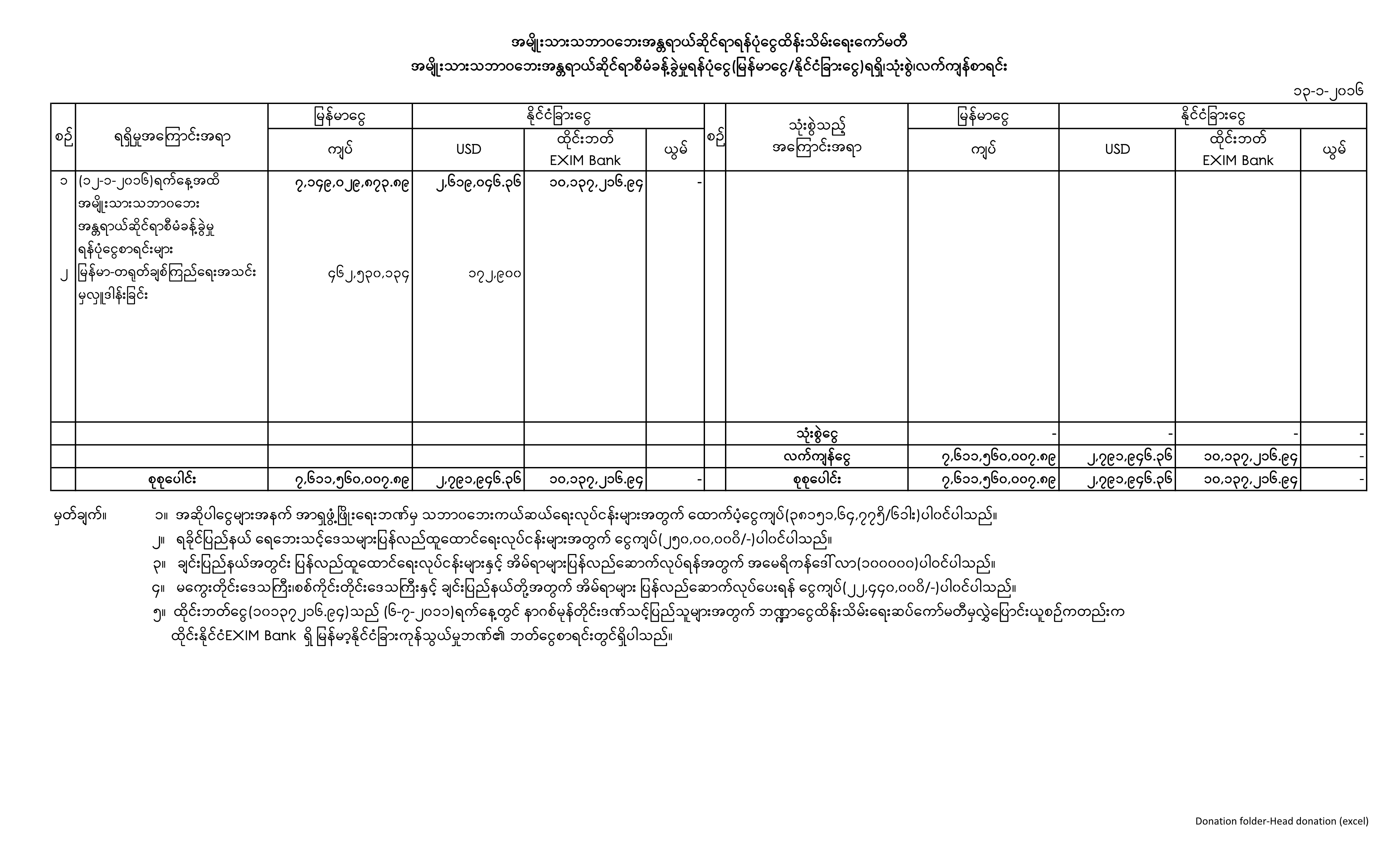 အမျိုးသားသဘာဝဘေးအန္တရာယ်ဆိုင်ရာစီမံခန့်ခွဲမှုရန်ပုံငွေထိန်းသိမ်းရေးကော်မတီမှ (၁၃-၁-၂၀၁၆) ရက်နေ့အထိ (မြန်မာငွေ/နိုင်ငံခြားငွေ) ရရှိ၊ သုံးစွဲ၊ လက်ကျန်စာရင်း