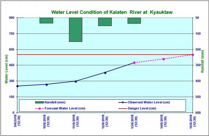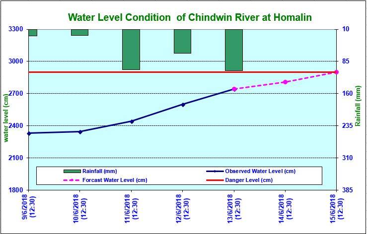 ၂၀၁၈ ခုနှစ်၊ ဇွန်လ (၁၃) ရက်နေ့၊ မြန်မာစံတော်ချိန် (၁၄:၀၀) နာရီအချိန်တွင် မိုးလေဝသနှင့် ဇလဗေဒညွန်ကြားမှုဦးစီးဌာနမှ မြစ်ရေကြီးခြင်း သတိပေးချက်ကို အောက်ပါအတိုင်း ထုတ်ပြန်ထားပါသည်-